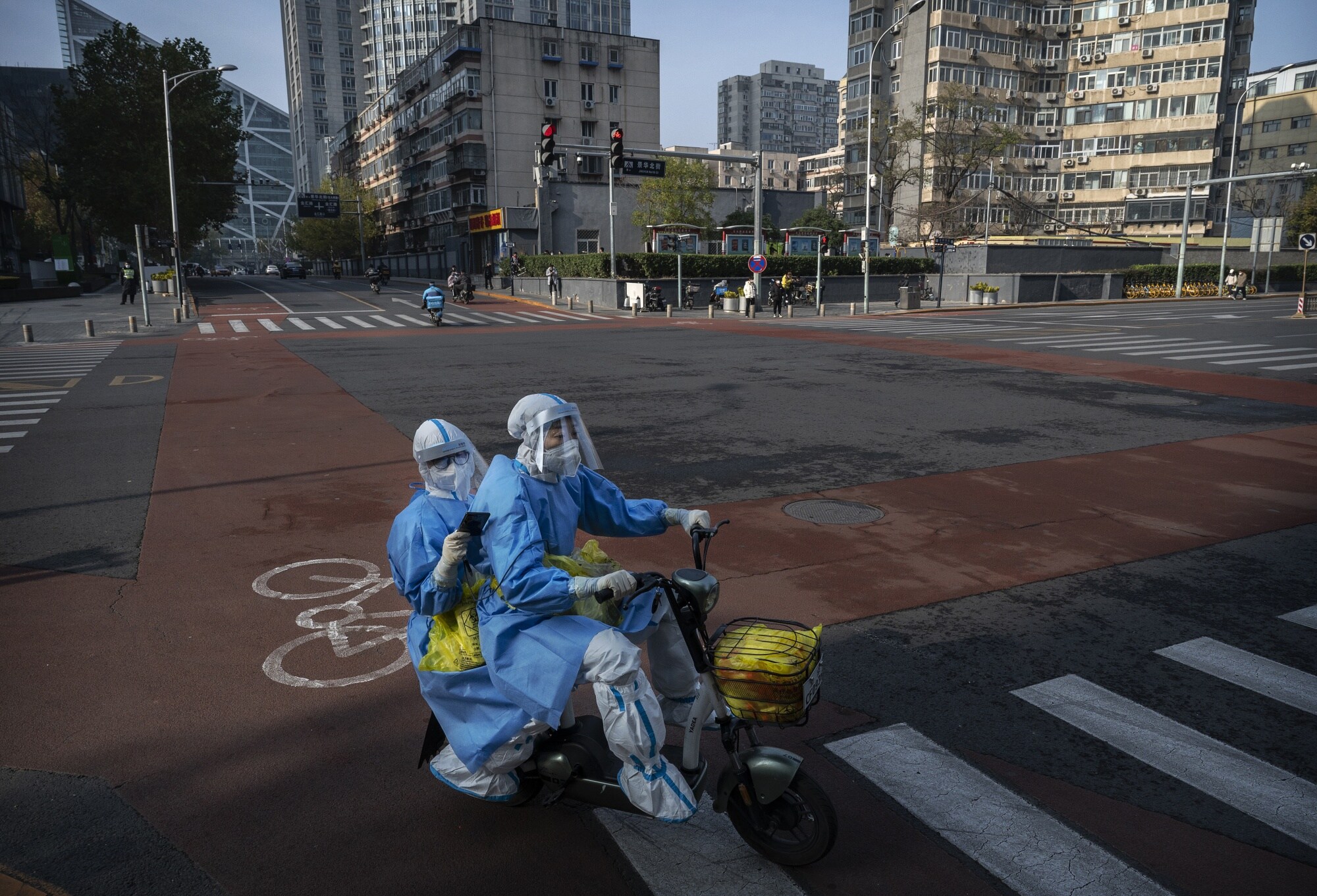 Epidemic control workers in a nearly empty street in Beijing on Nov. 23.