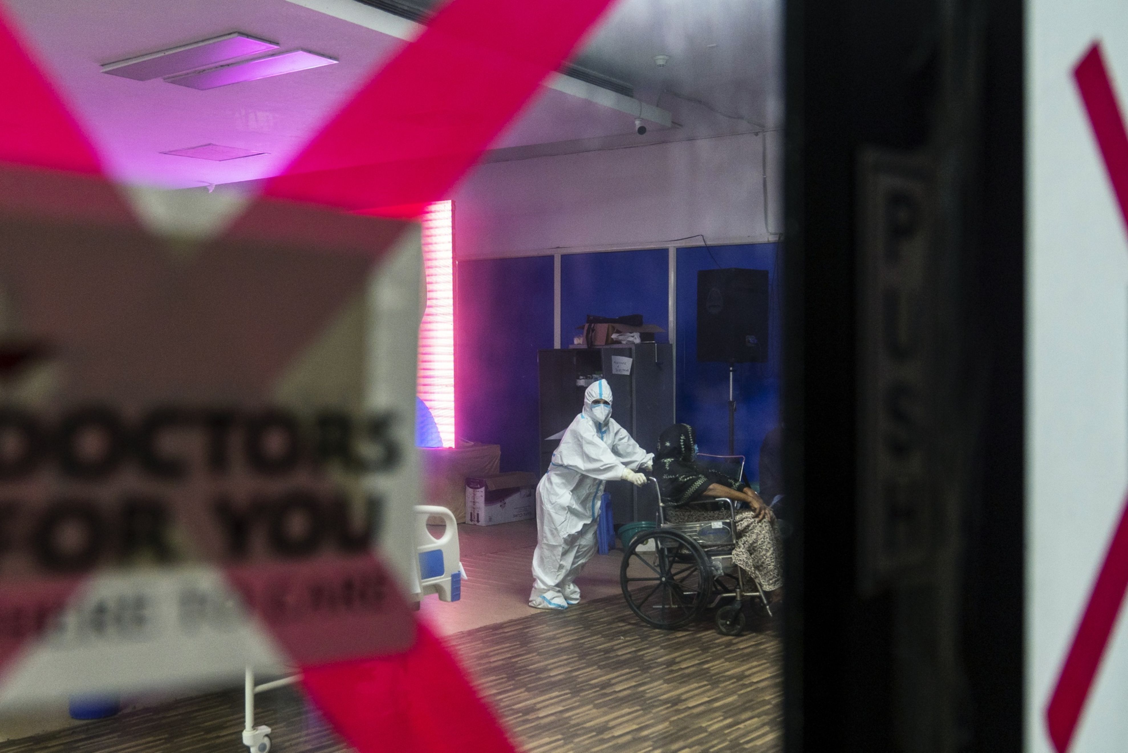 A health worker wearing personal protective equipment pushes a patient on a wheelchair at a Covid-19 health center in New Delhi. (Photographer: Sumit Dayal/Bloomberg)