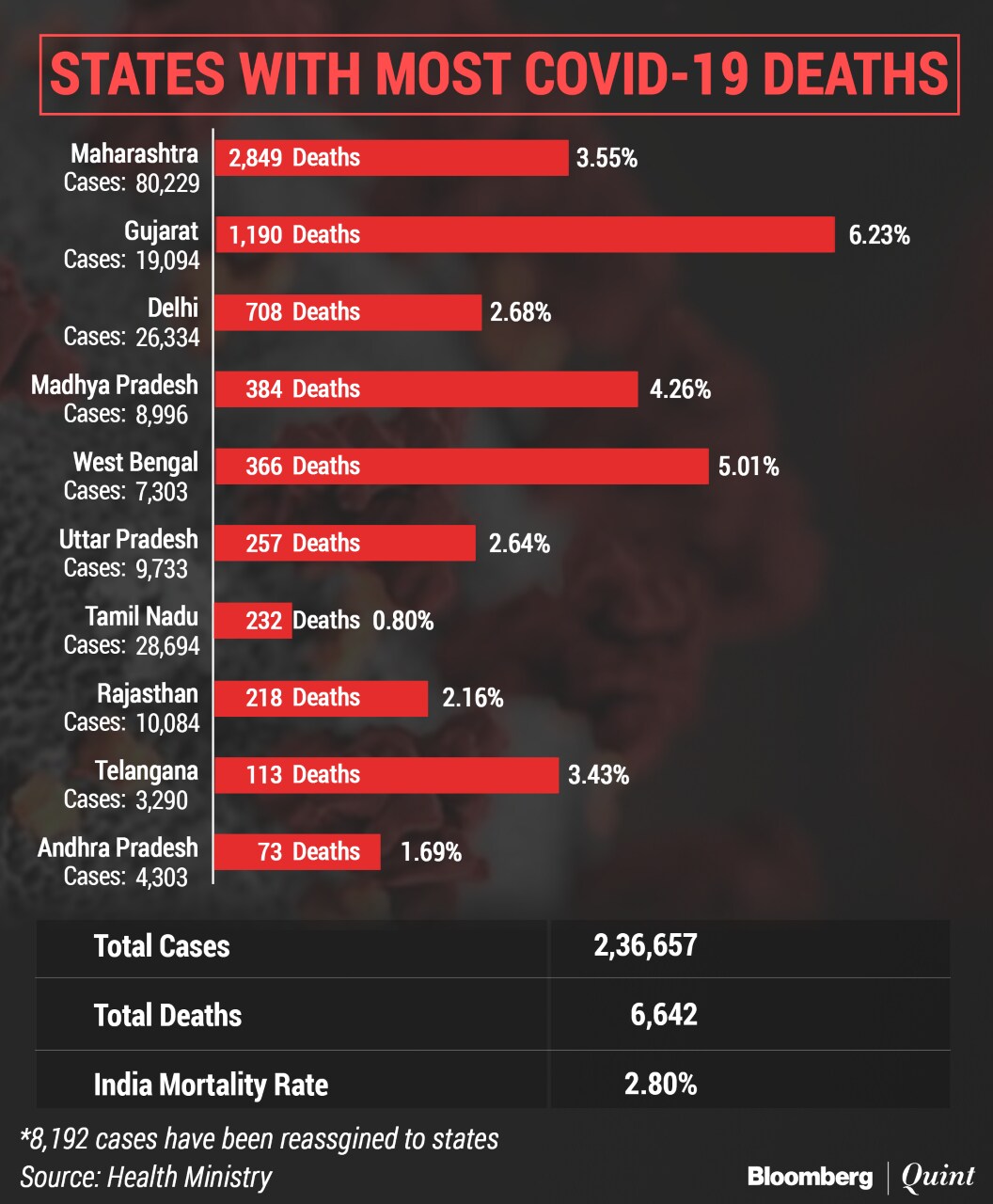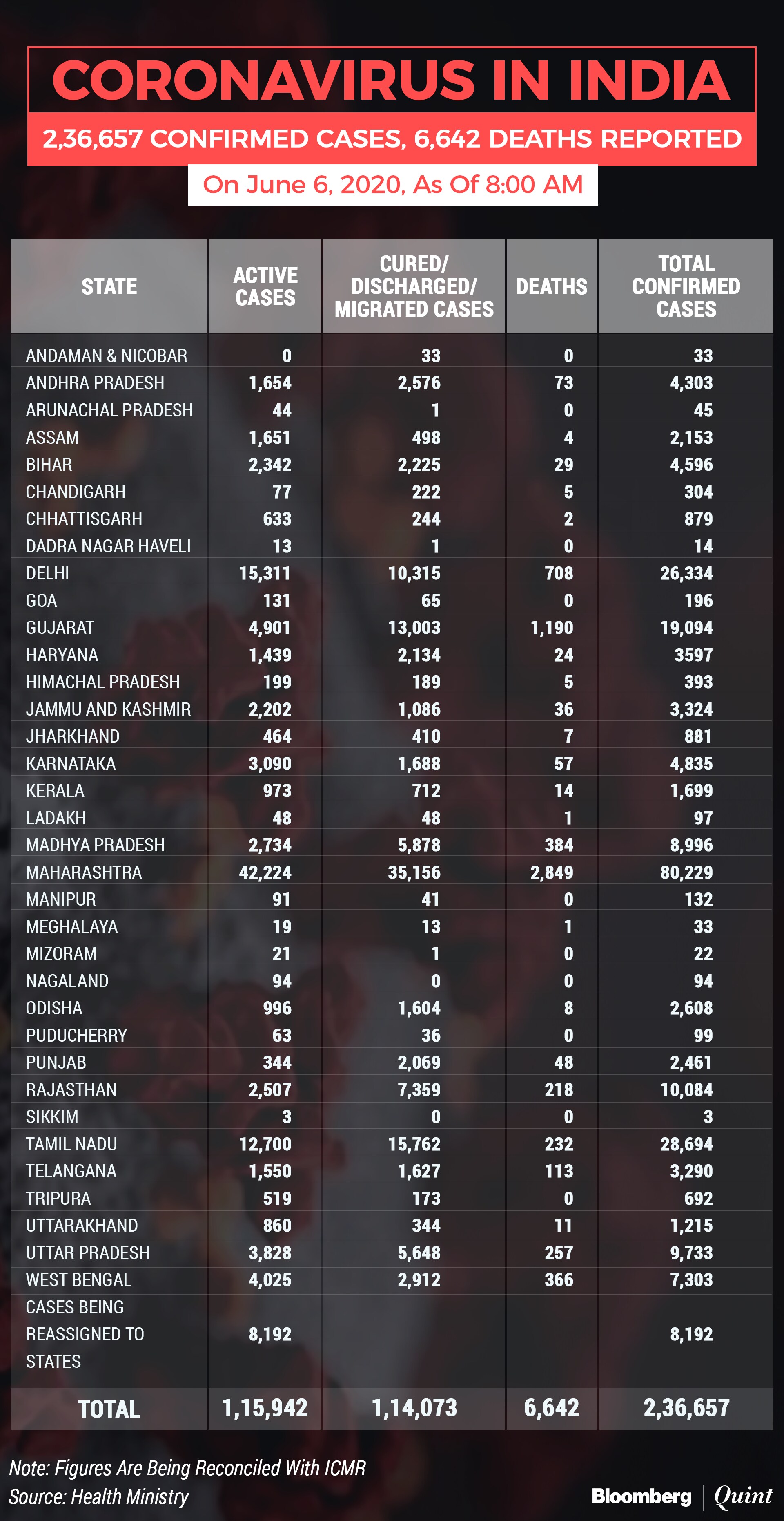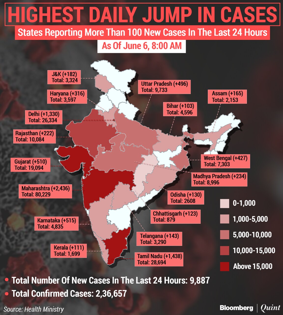 India added 9,887 new cases of novel coronavirus over the last 24 hours, taking the total tally to 2,36,657, according to health ministry's 8 a.m. update. This includes 1,14,073 patients who've recovered and 6,642 deaths.