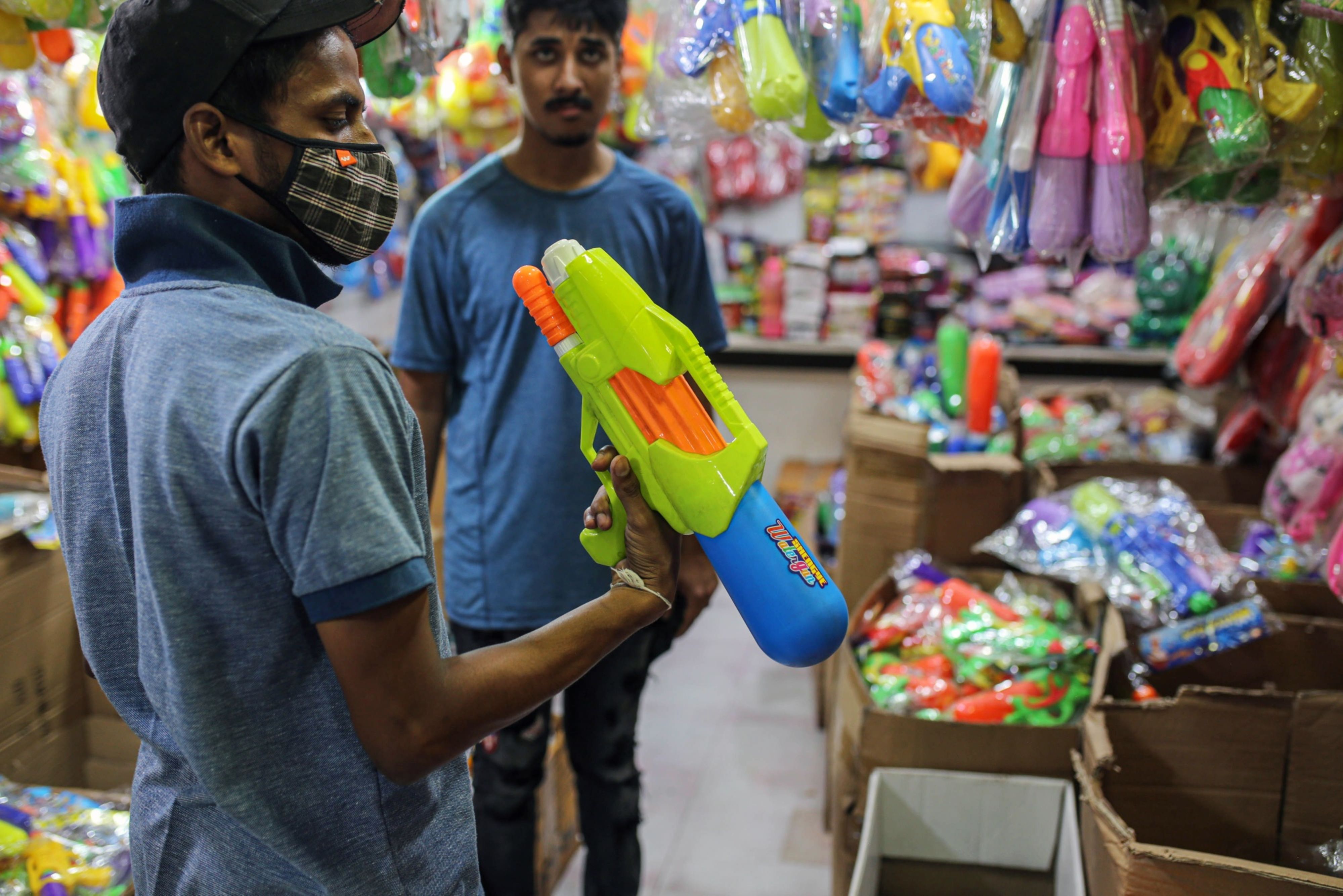 A customer looks at a water pistol at a store in Mumbai a day before the Holi festival. Celebrations are muted in India on account of Covid-19.(Photographer: Dhiraj Singh/Bloomberg)
