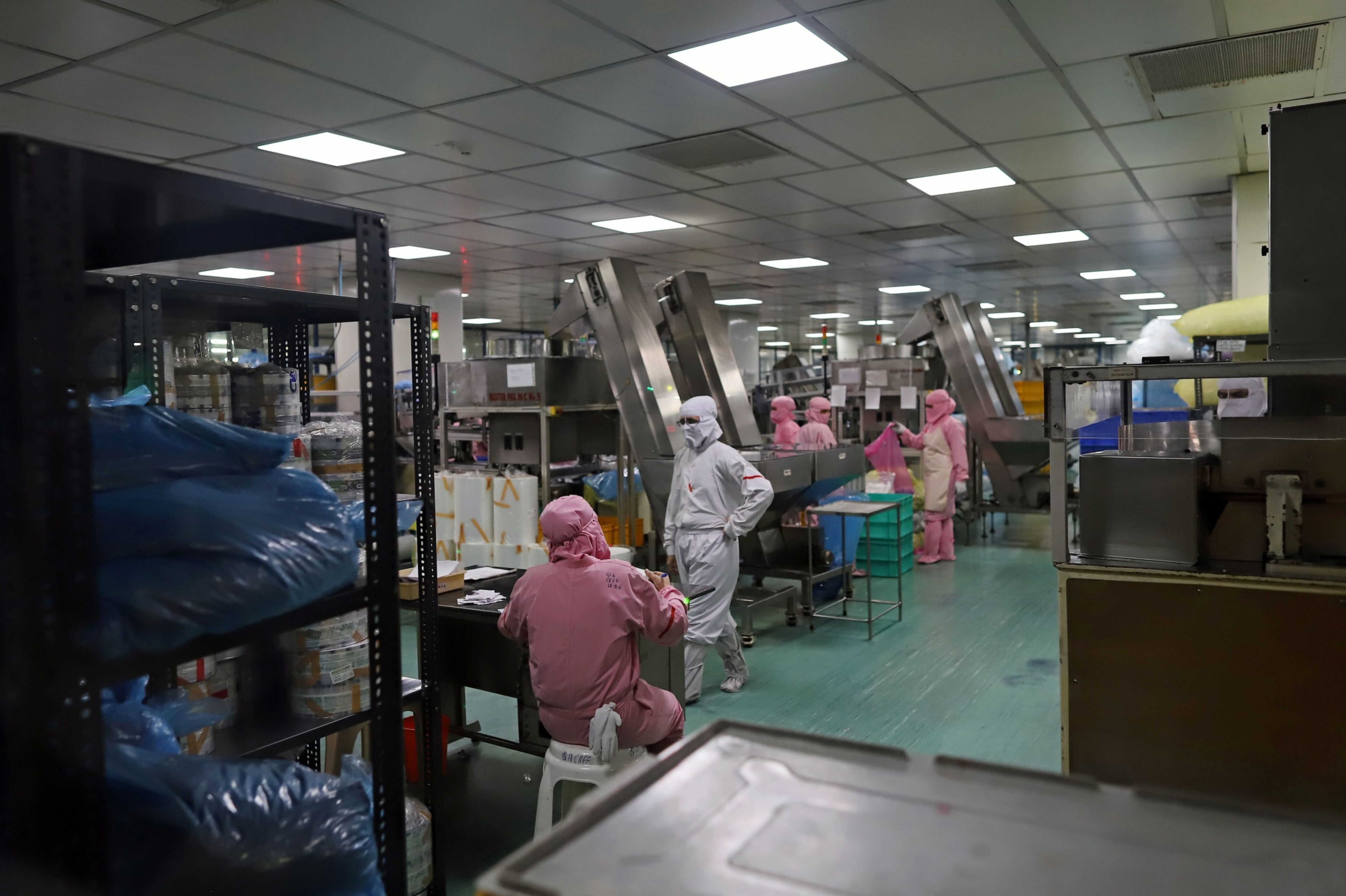 Employees work on a syringe production line in Faridabad, Haryana, on March 11, 2021. (Photographer: Anindito Mukherjee/Bloomberg)