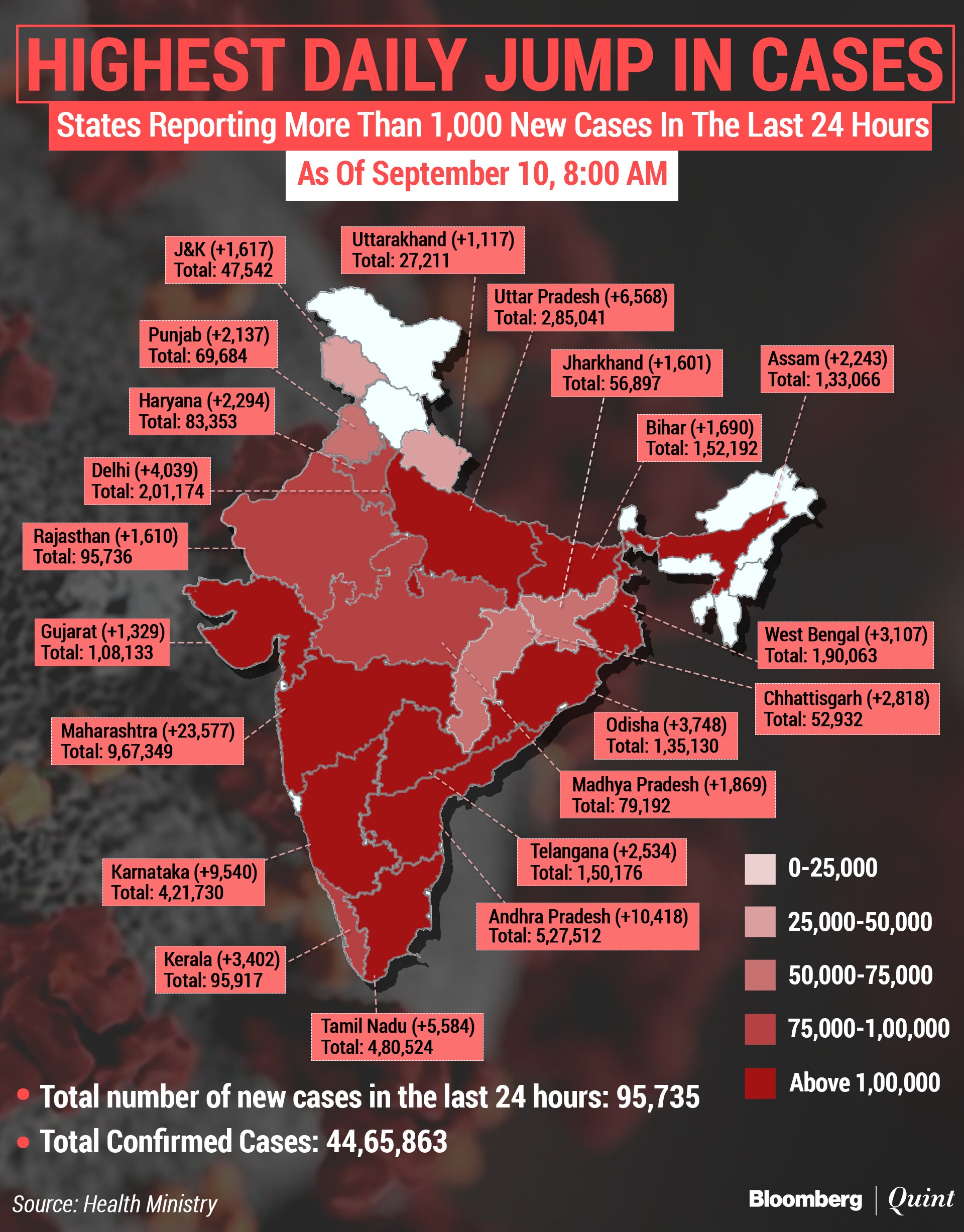 Coronavirus India Updates: India Reports Nearly 96,000 New Cases To Take Total Tally Above 44 Lakh