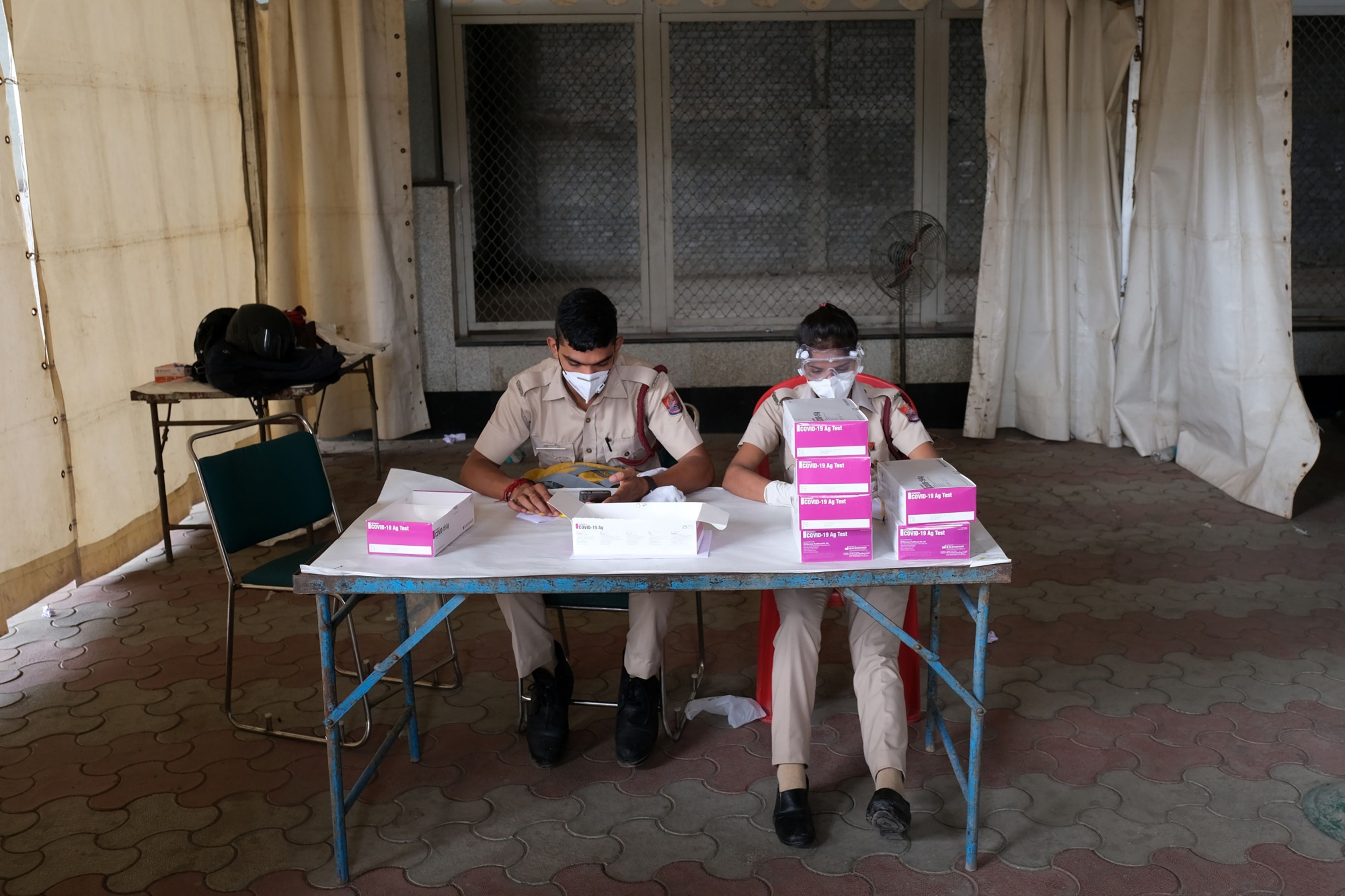 Boxes of Standard Q Covid-19 Ag Test kits produced by SD Biosensor Inc. for rapid antigen testing sit on a table at a temporary facility set up at the Anand Vihar inter-state bus terminal in New Delhi, India. (Photographer: T. Narayan/Bloomberg)