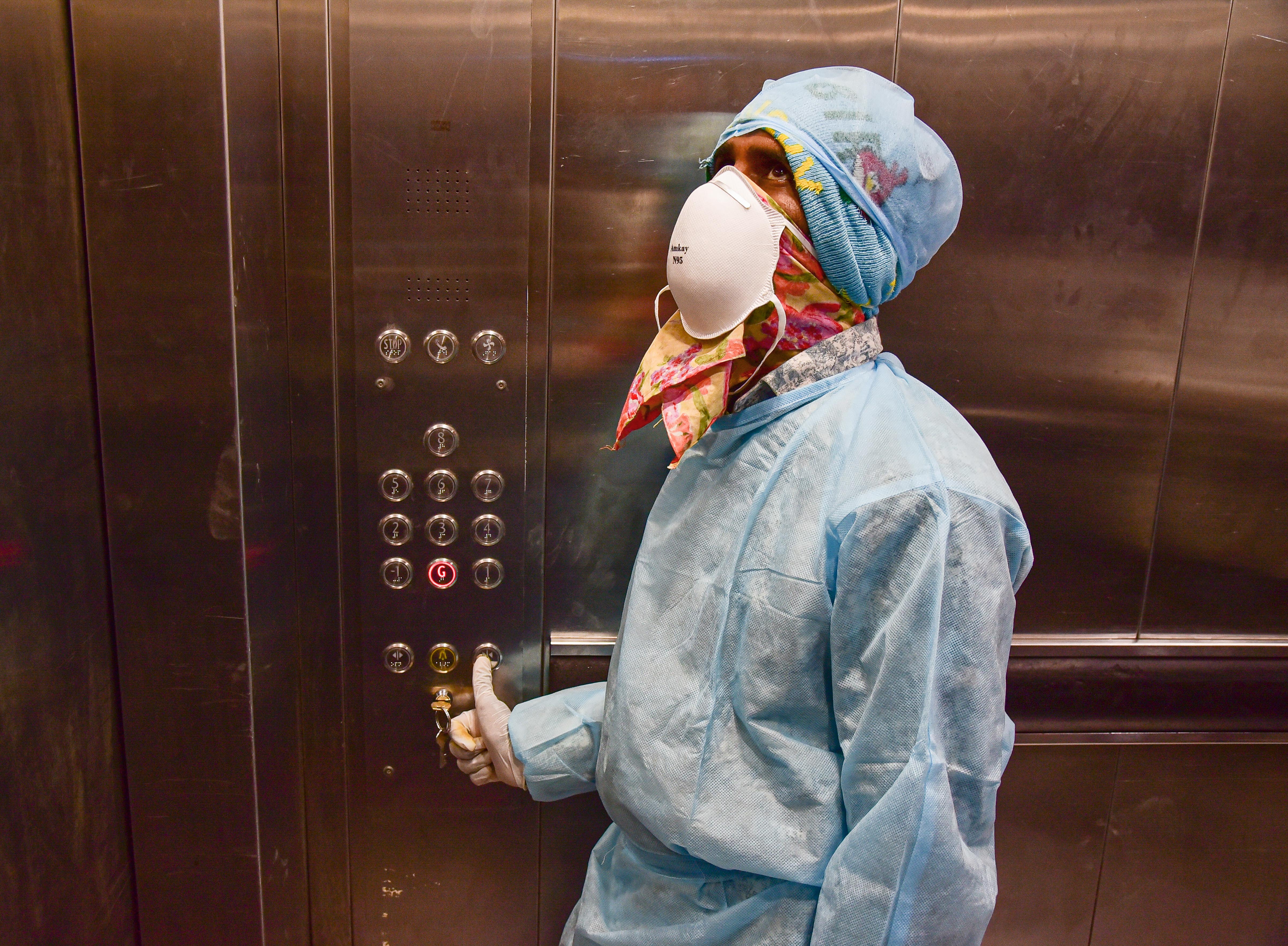 A medic takes a special lift meant for medics and patients of coronavirus at Gandhi Hospital in Hyderabad, India, on March 2, 2020. (Photo: PTI)