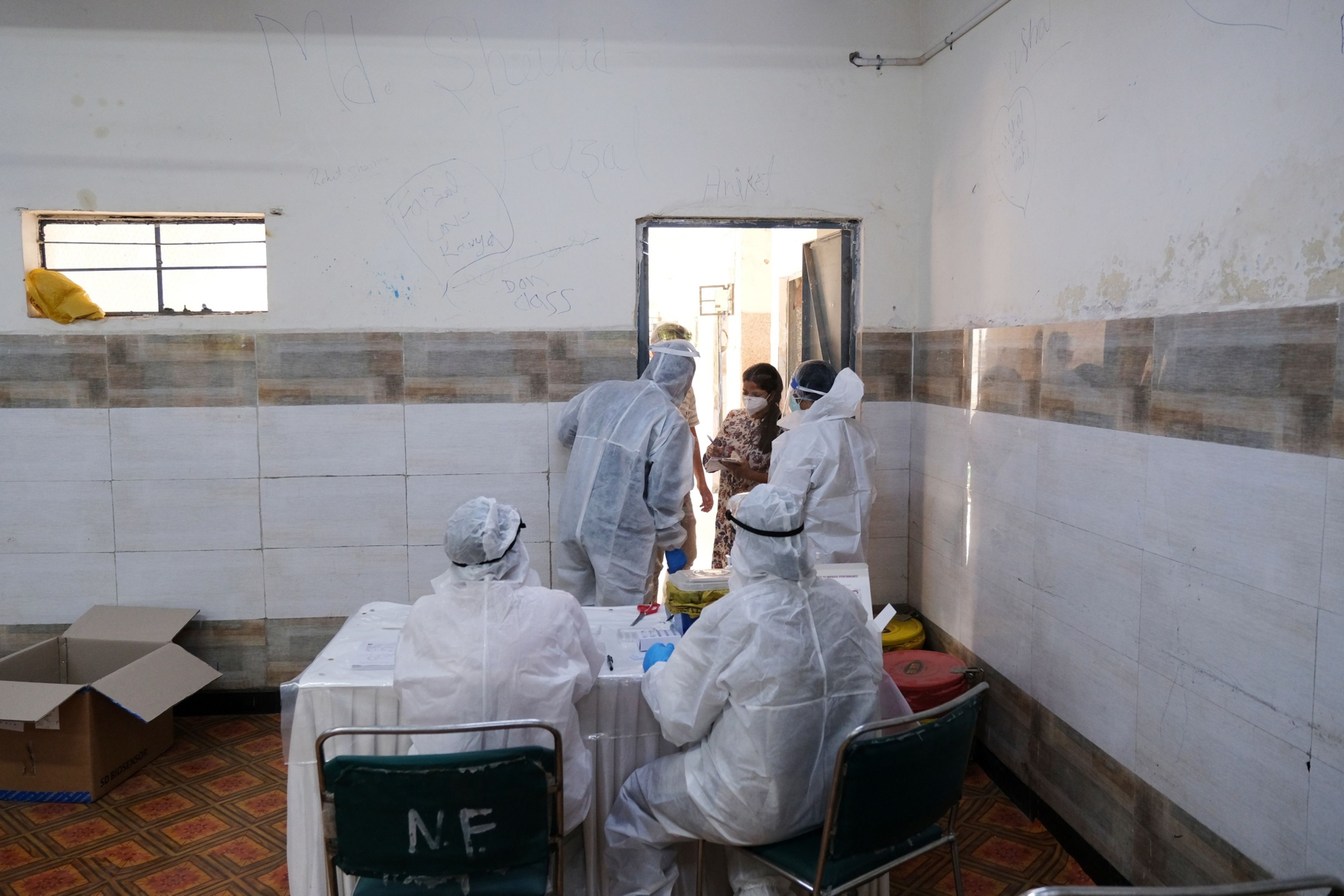 Health workers wearing personal protective equipment work at a rapid-antigen methodology Covid-19 testing center set up at school in New Delhi. (Photographer: T. Narayan/Bloomberg)