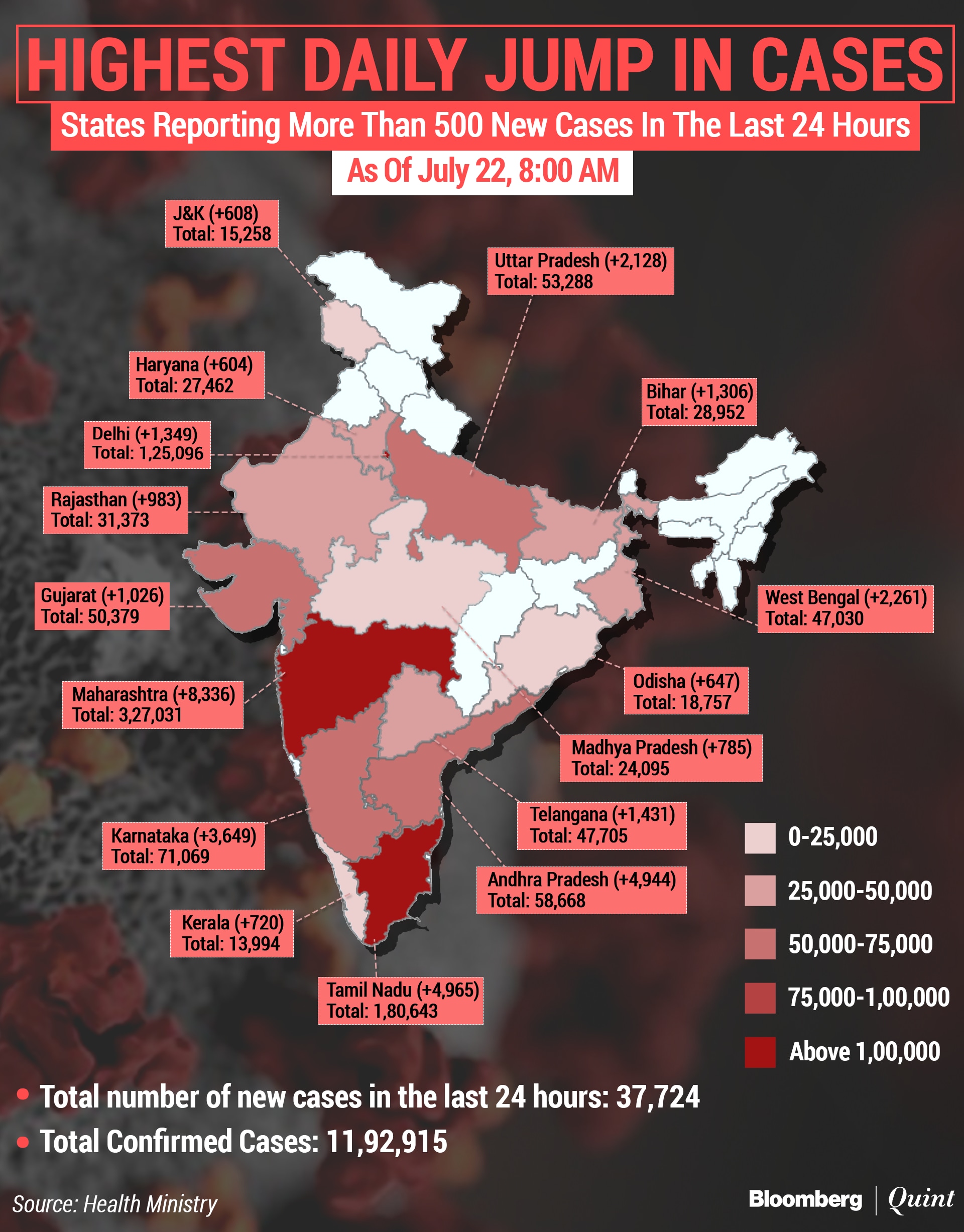 According to Union Health Ministry figures on Wednesday, the number of cases in Jammu and Kashmir has risen to 15,258, up from 7,497 on June 30.