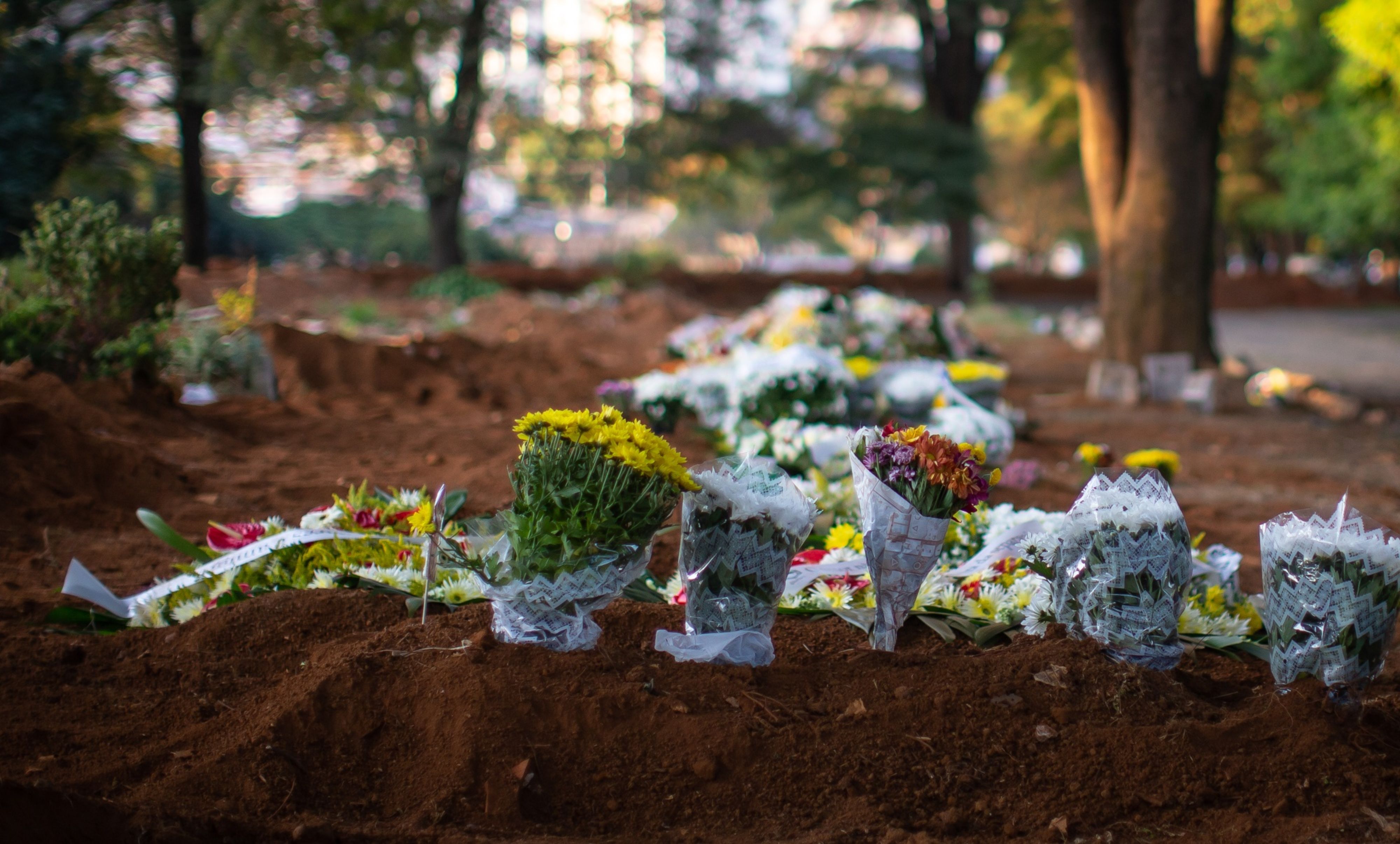 Flowers are placed on the graves of Covid-19 victims in Sao Paulo, on April 29, 2020. (Photographer: Jonne Roriz/Bloomberg)