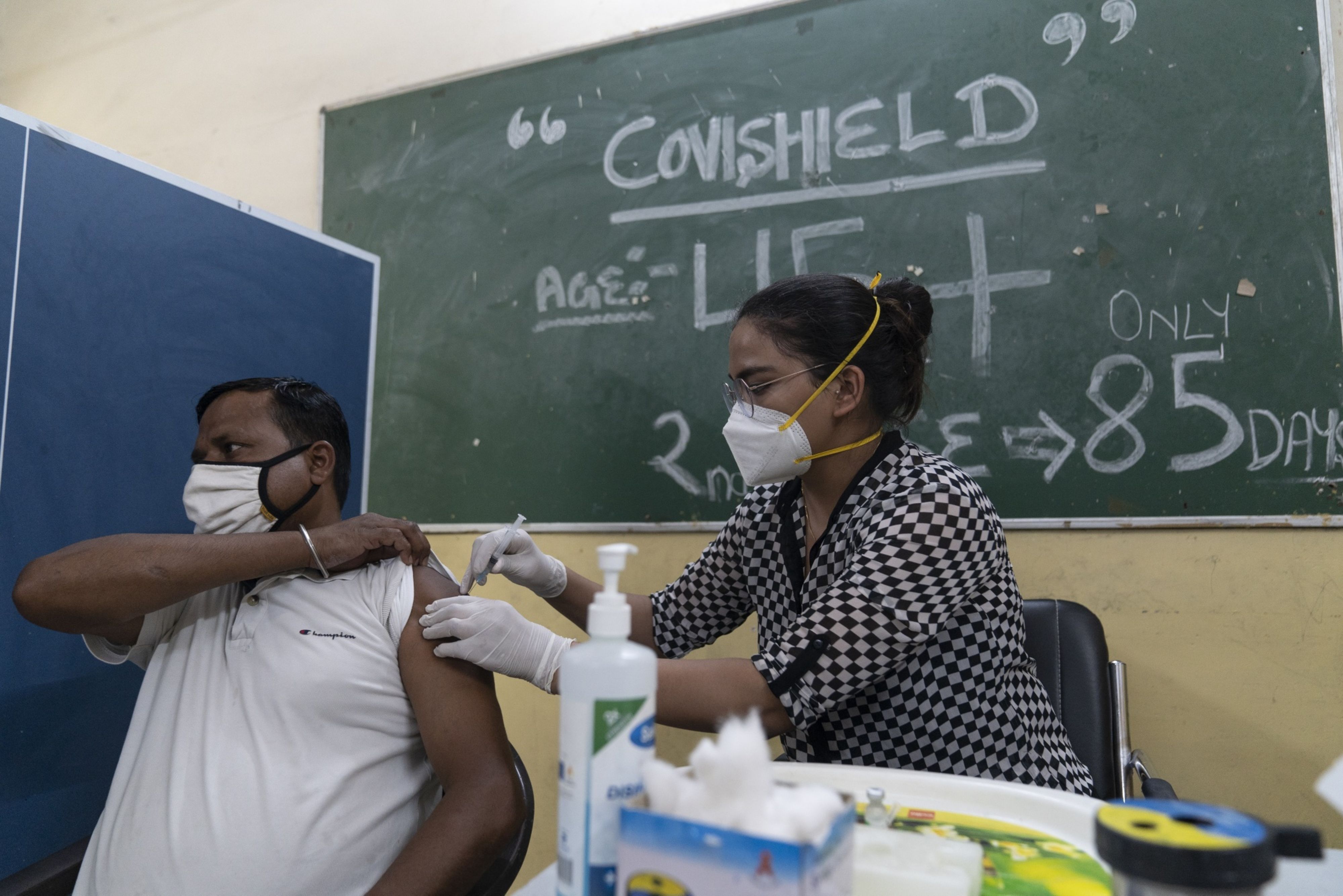 A health workers administers a dose of the Covishield vaccine at a vaccination center set up at Navyug School in New Delhi. (Photographer: Sumit Dayal/Bloomberg)