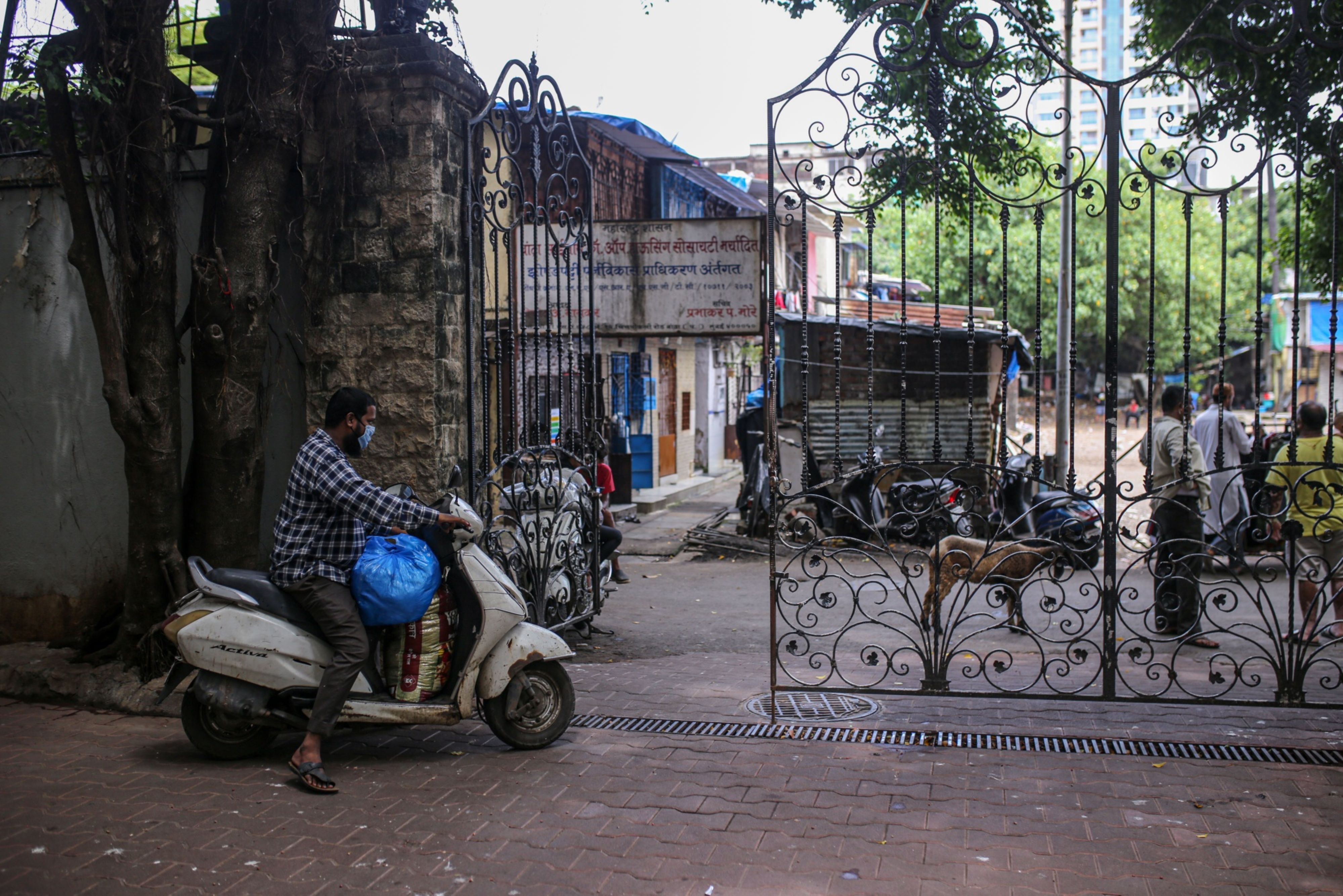 A volunteer for Khana Chahiye departs the foundation's commercial kitchen to distribute free food packs to those in need in Mumbai. (Photographer: Dhiraj Singh/Bloomberg)