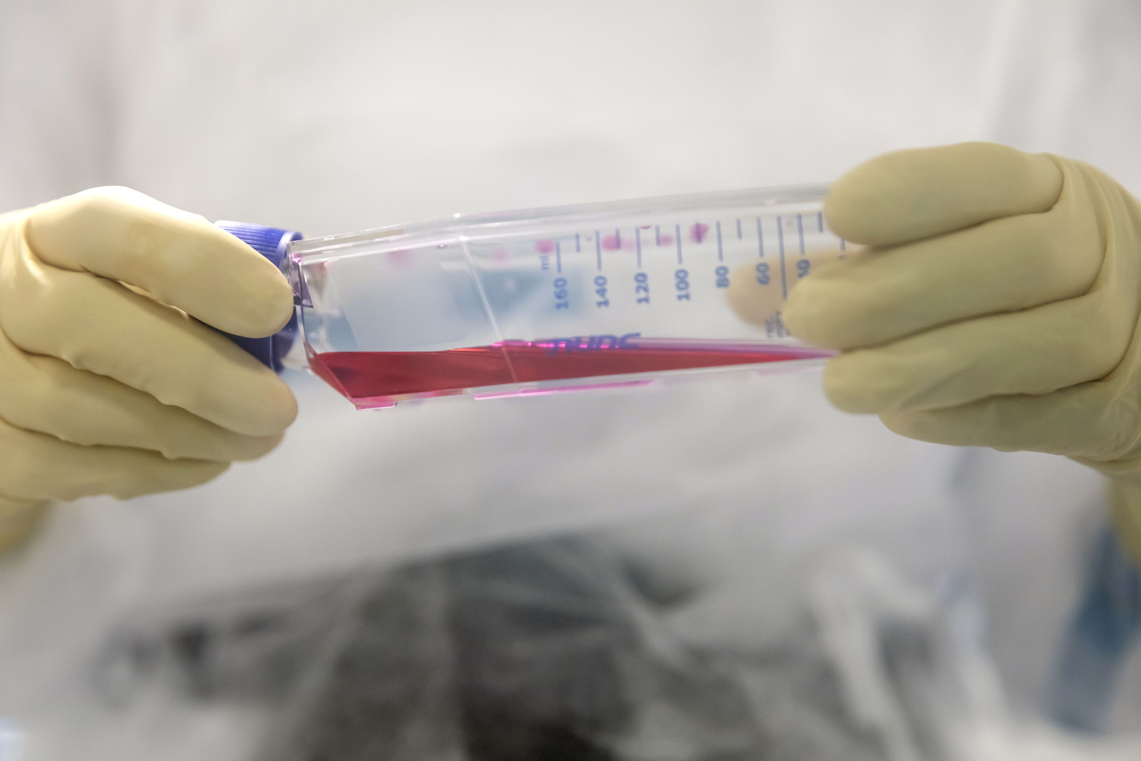 A French National Centre for Scientific Research (CNRS) researcher holds a flask containing cells to be infected with Covid-19 during coronavirus vaccine research work inside the Pasteur Institute laboratories. (Photographer: Adrienne Surprenant/Bloomberg)