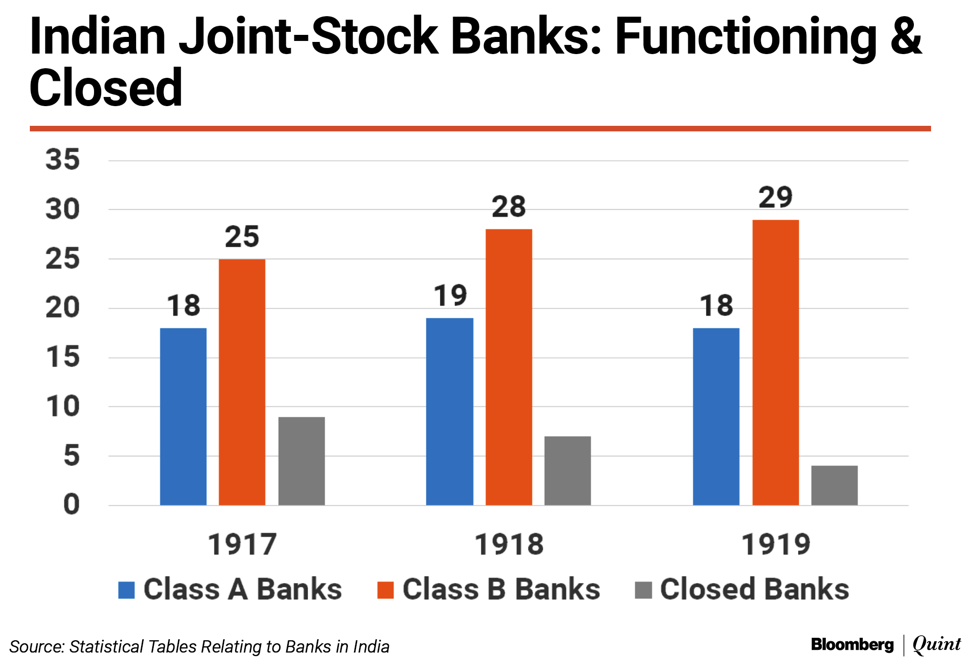 Let us now review the conditions of Indian banks. The number of A-class banks (with capital and reserves greater than Rs 5 lakh) and B-class banks (with capital and reserves between Rs 1 lakh and Rs 5 lakh) remained steady. The number of banks that closed in 1918 and 1919 declined as well. This period also sowed the seeds for the establishment of a large number of industrial banks in the country. The one big name was Tata Industrial Bank which started amidst big fanfare but could not sustain and was merged with Central Bank of India in 1923.