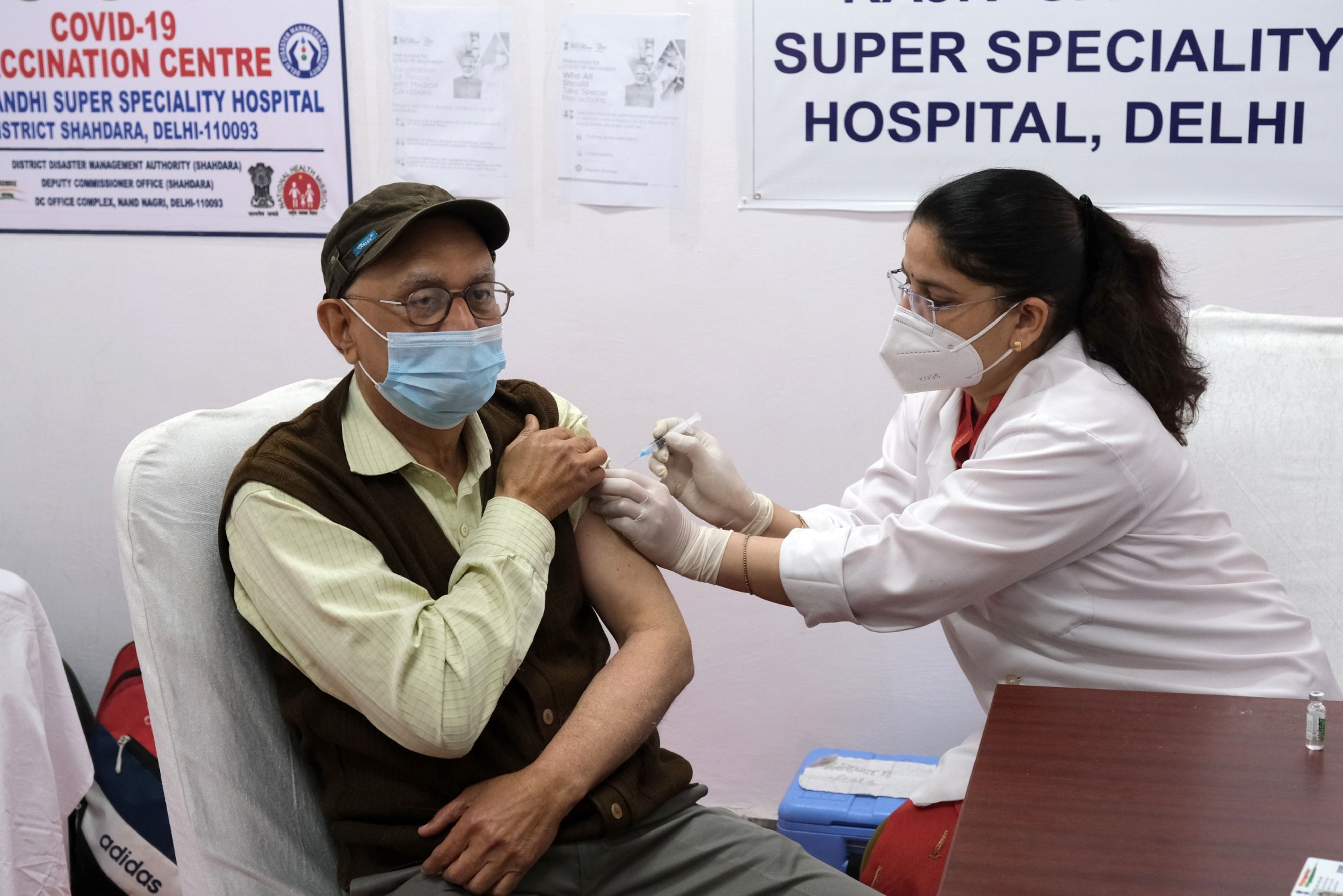 A health worker administers the Covishield vaccine, to a senior citizen at a hospital in New Delhi. (Photographer: T. Narayan/Bloomberg)