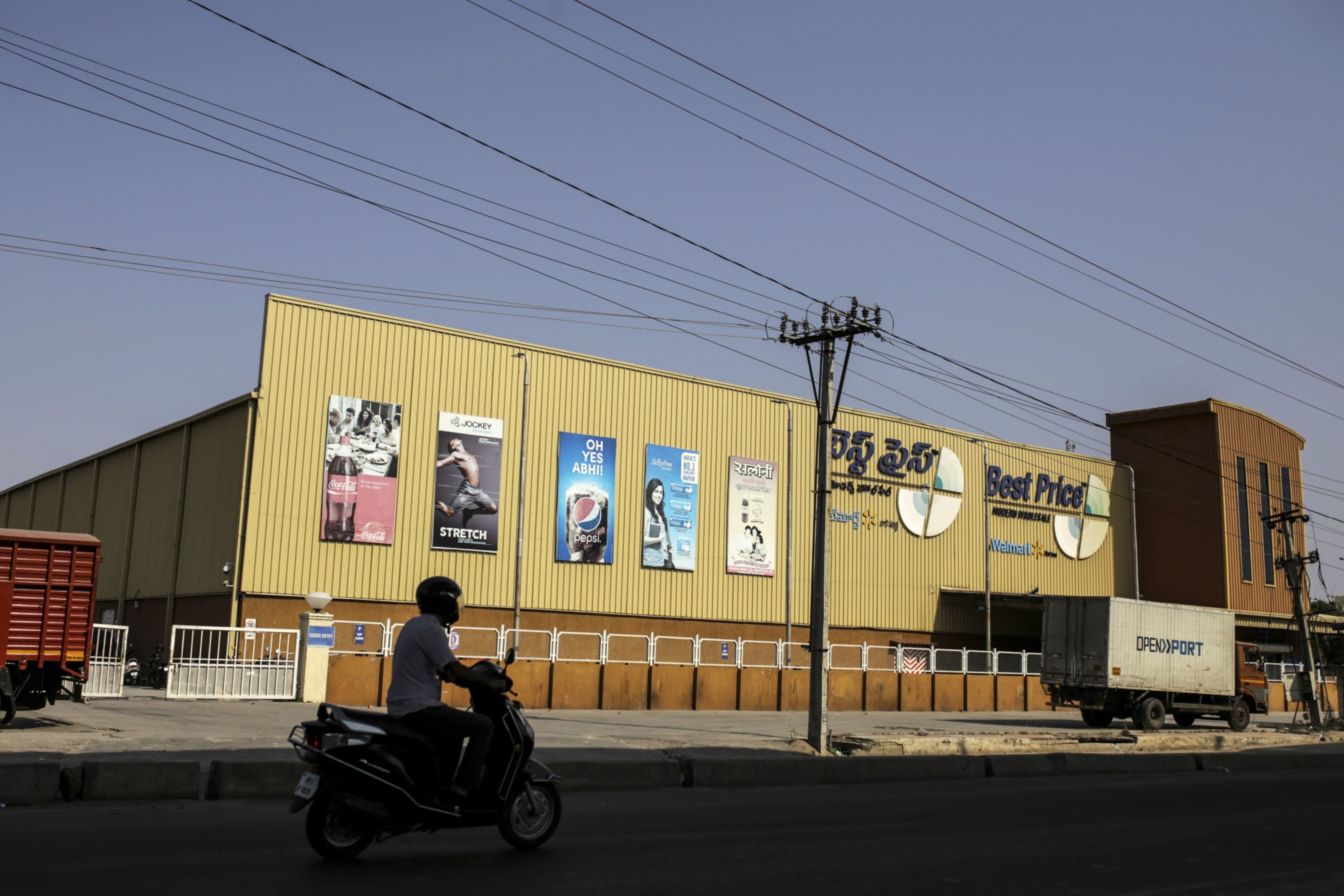 A motorcyclist rides past a Walmart store in Hyderabad. (Photographer: Dhiraj Singh/Bloomberg)