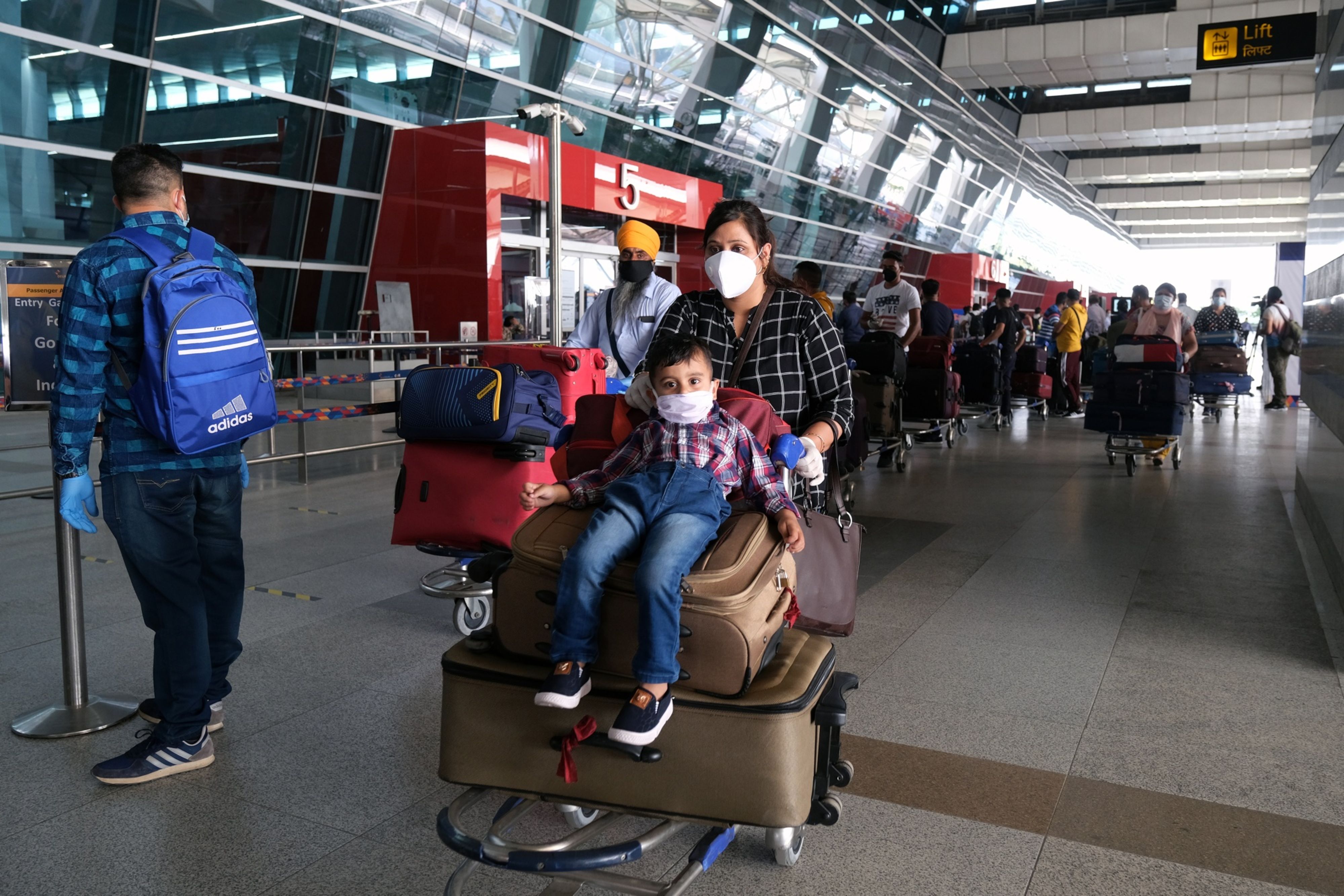 Travelers wearing protective masks wait to enter Terminal 3 of the Indira Gandhi International Airport in New Delhi. (Photographer: T. Narayan/Bloomberg)