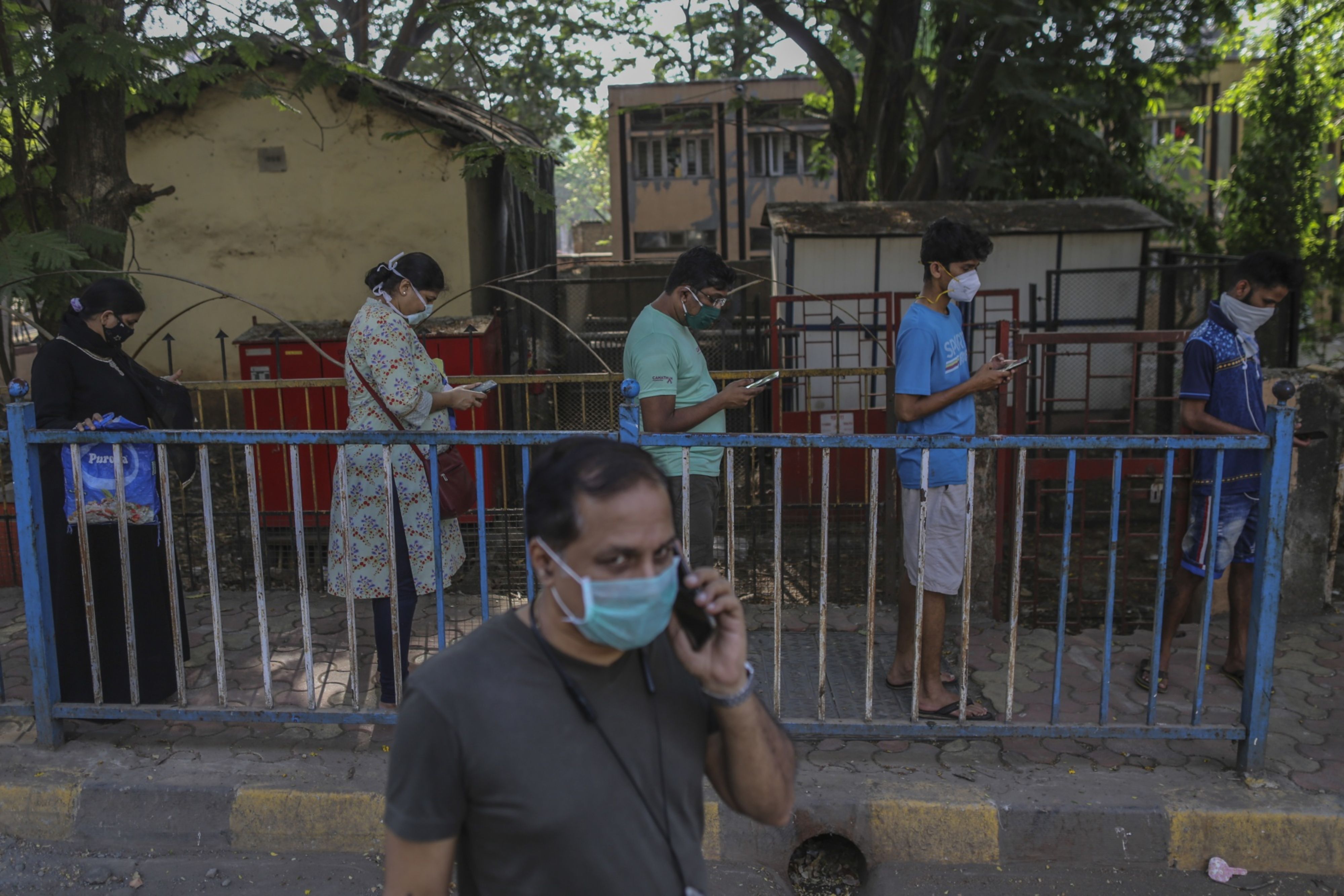 People wearing protective masks practice social distancing at a market in Mumbai. (Photographer: Dhiraj Singh/Bloomberg)