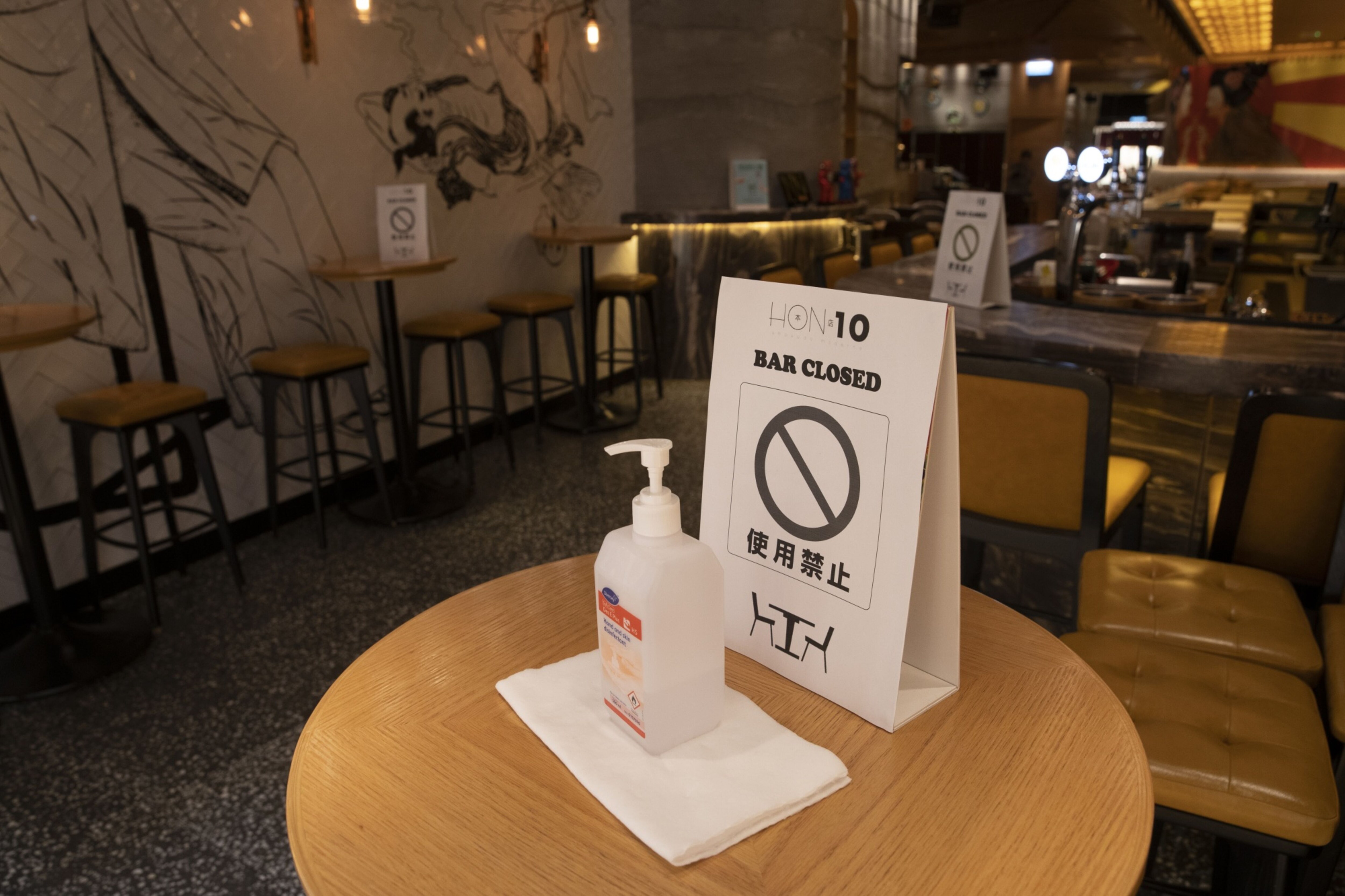 A hostess, also with a mask and gloves on, greets you but keeps her distance while aiming a thermal scanner at you. She points to a bottle of hand sanitiser. You rub it on and she pushes open the door.