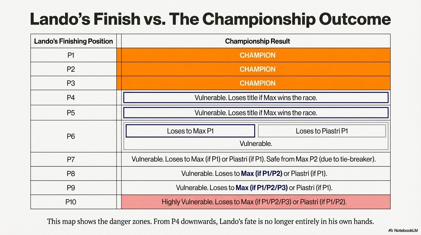 Norris, therefore, requires a podium in order to guarantee his victory without relying on the results of other drivers.
