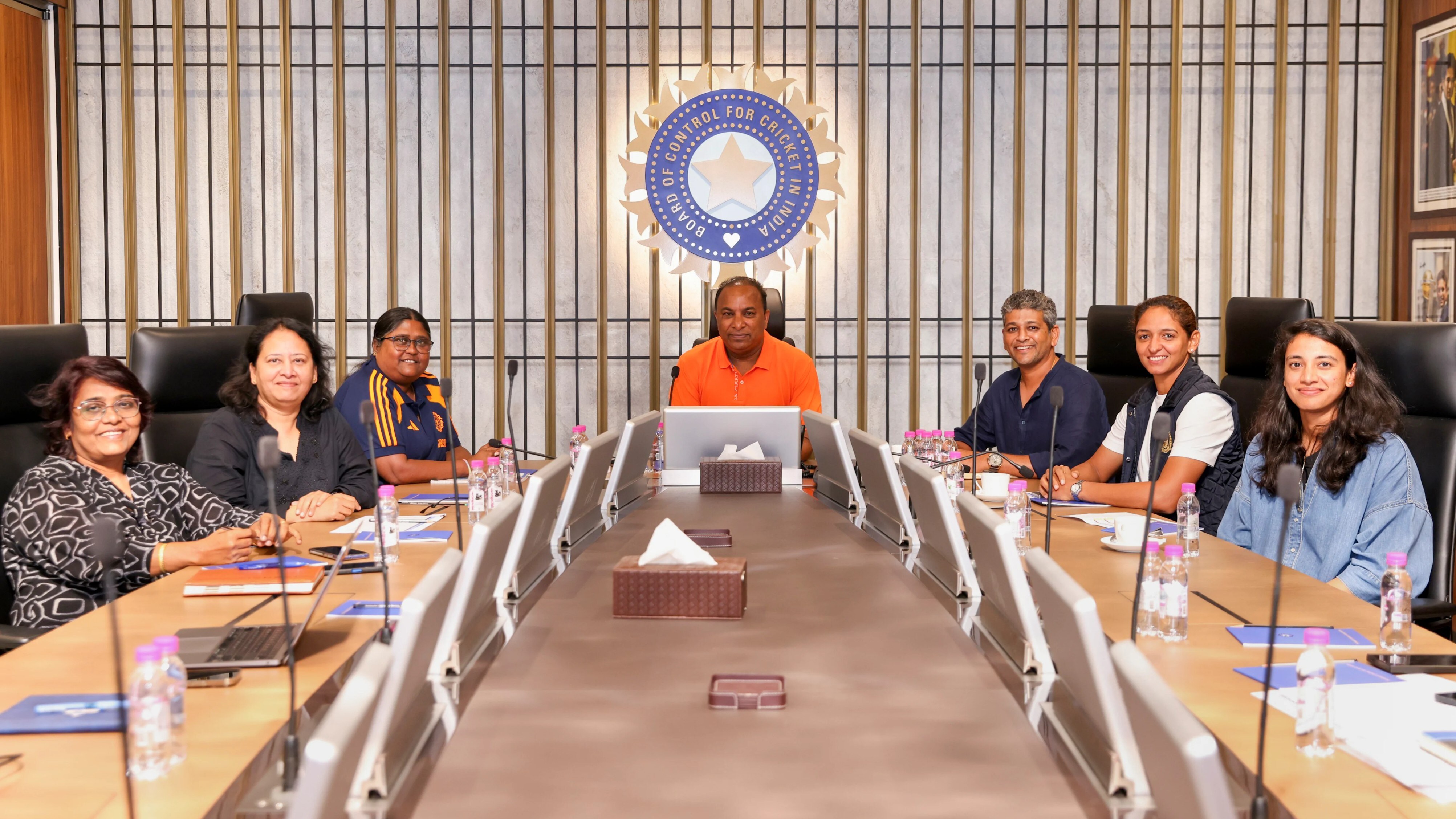 In this image via @BCCIWomen via X on Aug. 19, 2025, BCCI Secretary Devajit Saikia with members of the women's selection committee during a meeting for selection of the Indian squad for the upcoming three-match ODI series against Australia and the ICC Women's Cricket World Cup 2025. (@BCCIWomen/X via PTI Photo)