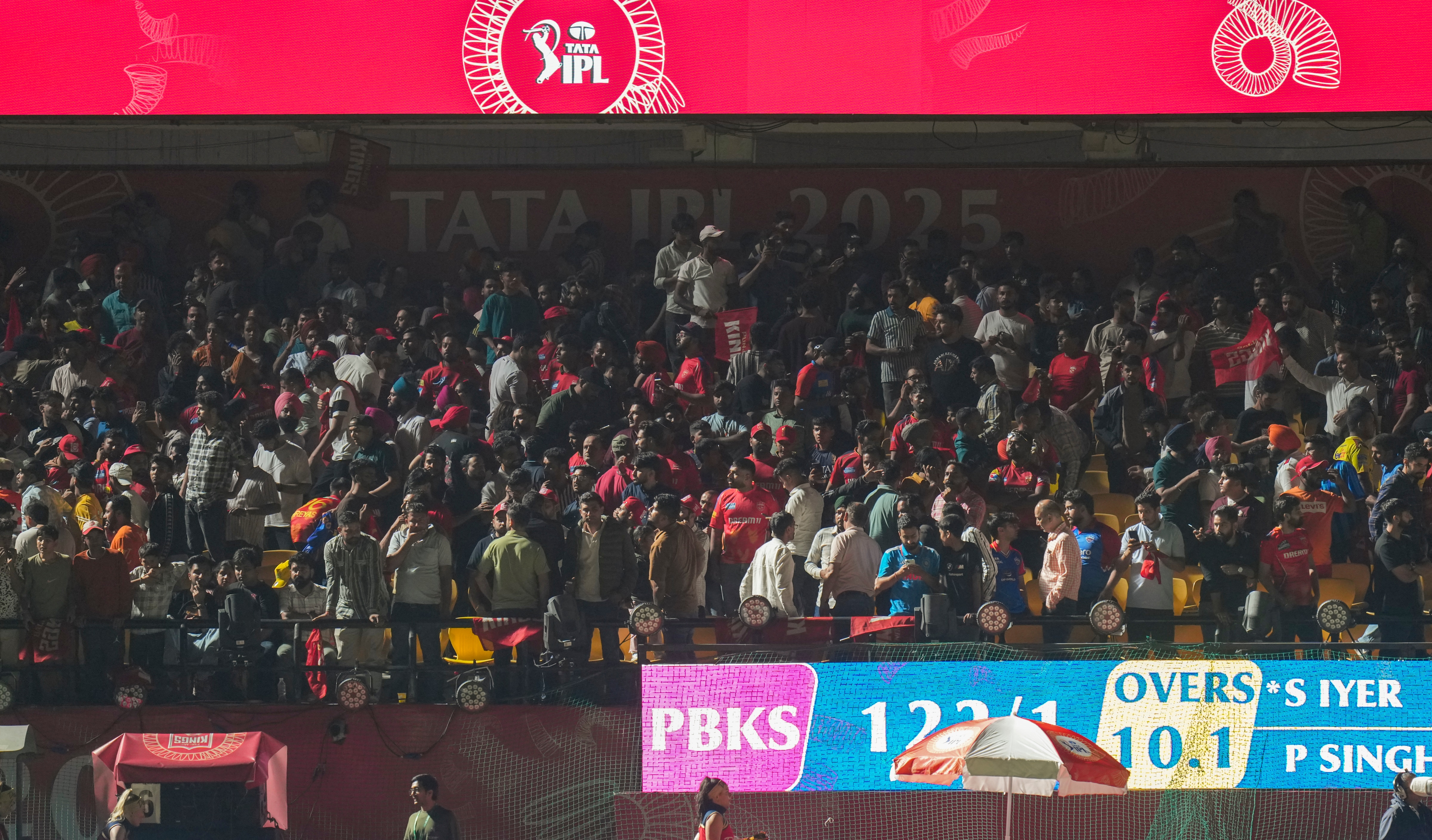 The Punjab side was 122 for 1 in 10.1 overs when the lights went out, initially attributed to floodlight failure. The game, which had already started late due to rain, was eventually called off, and teams and spectators were evacuated for their safety.