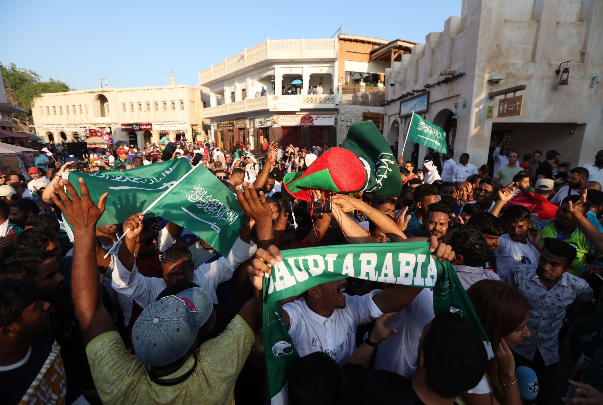 DOHA, QATAR - NOVEMBER 22: Saudi Arabia fans celebrate their side's victory in the Group C match against Argentina at Souq Waqif in the Mushayrib district on November 22, 2022 in Doha, Qatar. (Photo by Christopher Lee/Getty Images)