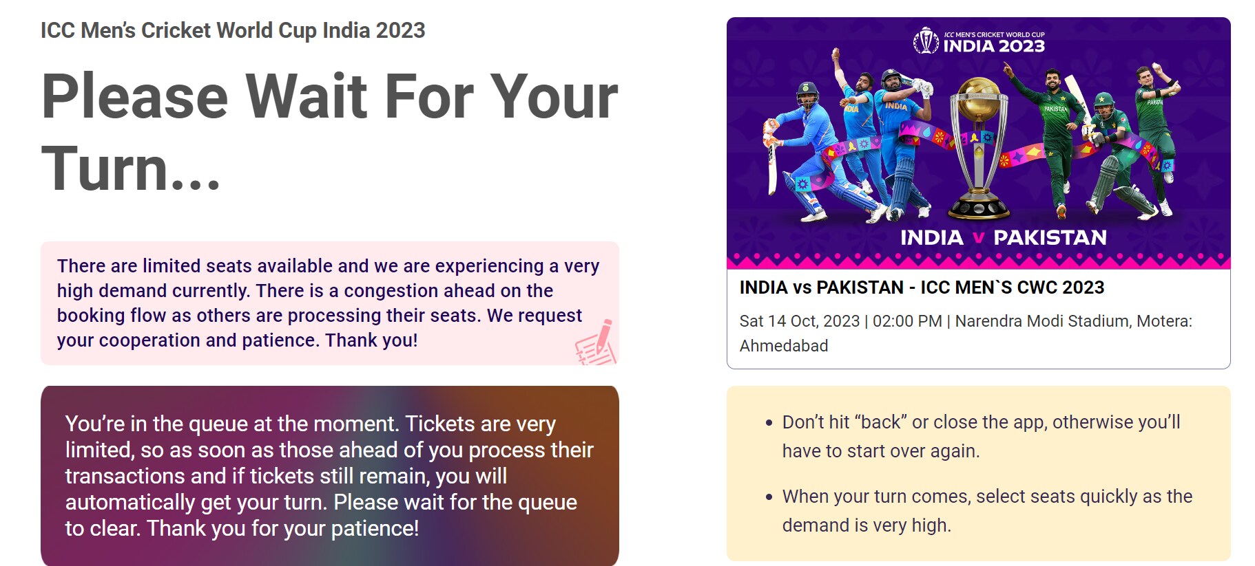 'There are limited seats available and we are experiencing a very high demand currently. There is a congestion ahead on the booking flow as others are processing their seats. We request your cooperation and patience. Thank you!'