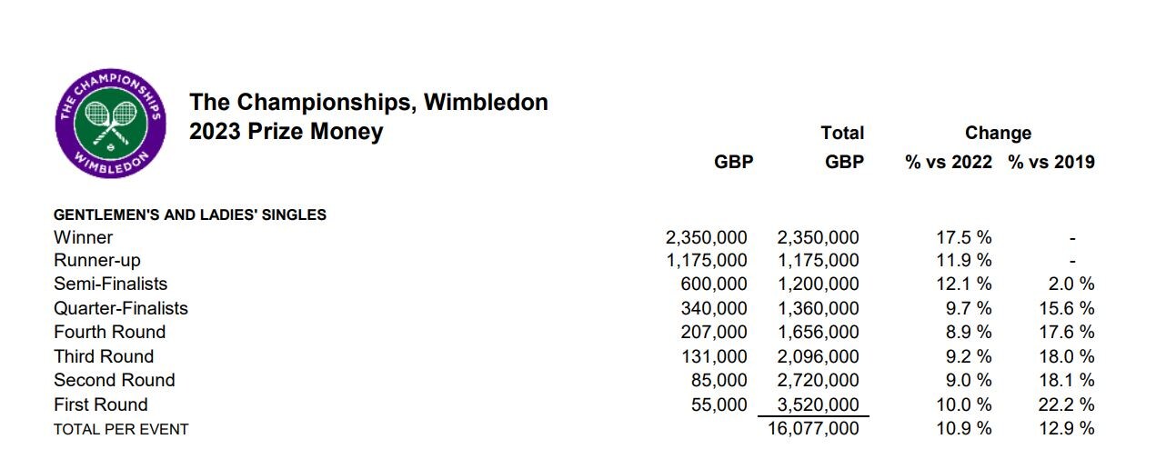 Wimbledon chiefs have confirmed that the prize money for the winners of this year's women's and men's singles has been increased from 17.5 percent from 2022. The women's and men's singles champions will receive £2,350,000 (Rs 24 crore) runners-up will receive £1,175,000 (Rs 12 crore).