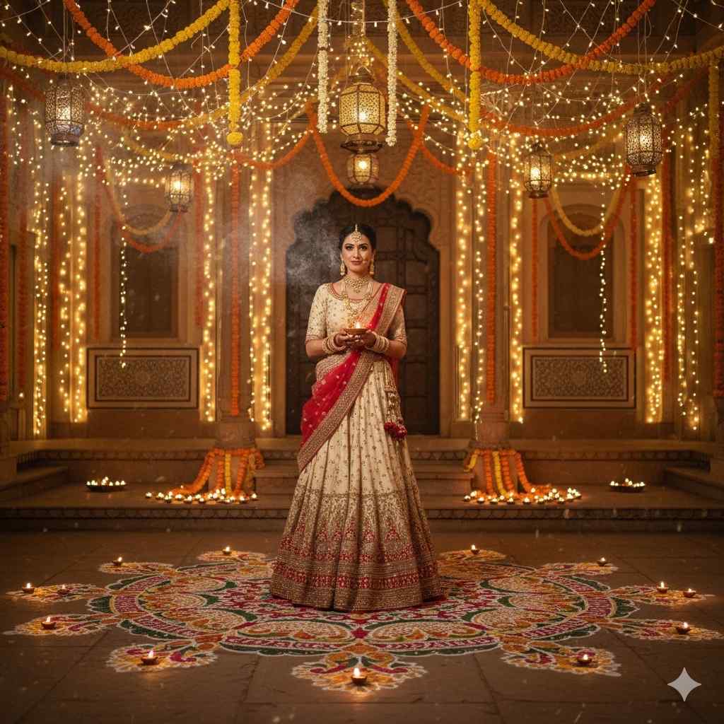 Generate a cinematic Diwali scene featuring a woman dressed in a cream and red lehenga adorned with golden zari embroidery, with her jewelry sparkling as she holds a diya. She is standing in the middle of a beautifully decorated courtyard that has garlands of marigolds hanging in the background, along with festive lights all around, and rangoli decorated with diyas on the ground.