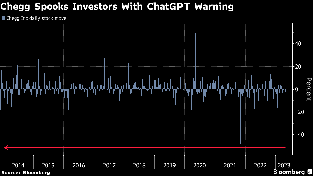Shares of a California education company called Chegg Inc. plunged Tuesday after it warned that the quick rise to popularity of OpenAI's ChatGPT tool is causing fewer students to sign up for its services. And that's having ripple effects, driving shares of UK education publisher Pearson Plc down the most in more than a year.