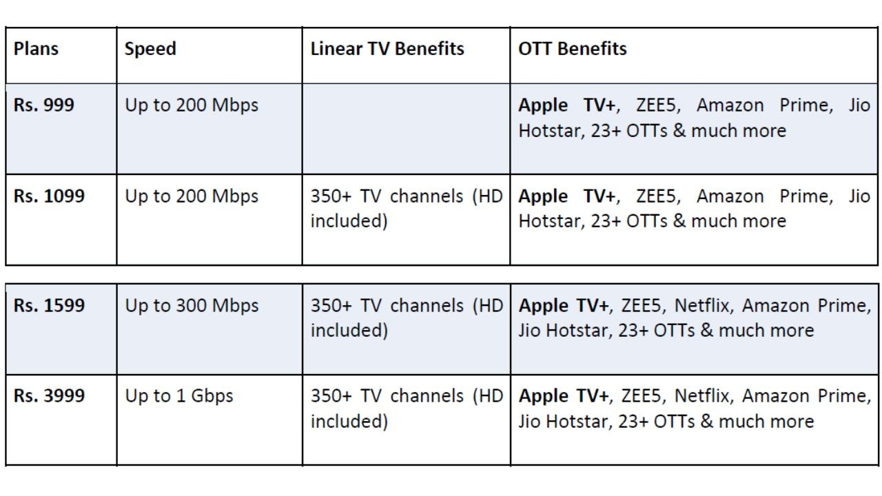 Check Airtel Home Wi-Fi plans table starting at Rs 999 below: