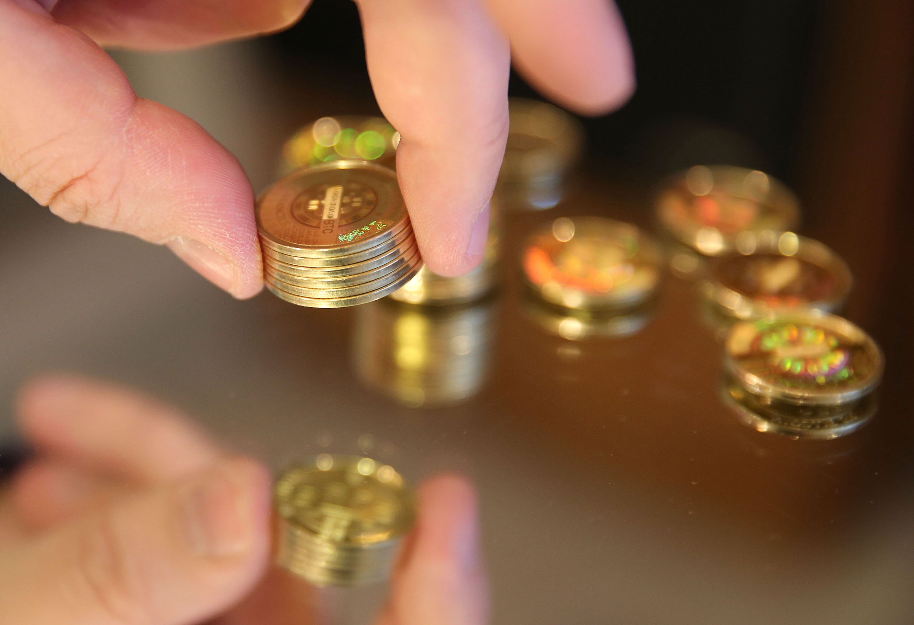 A person stacks Bitcoins that were just made for a photograph in Sandy, Utah, U.S. (Photographer: George Frey/Bloomberg)