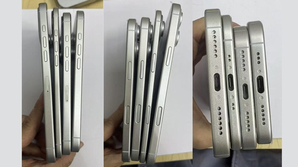 One can clearly make out the Air variant among the four; it's the thinnest with just about enough space for the USB port and side buttons. Going by earlier leaks and rumours, the iPhone 17 Air will measure a mere 5.65mm at its thinnest.
