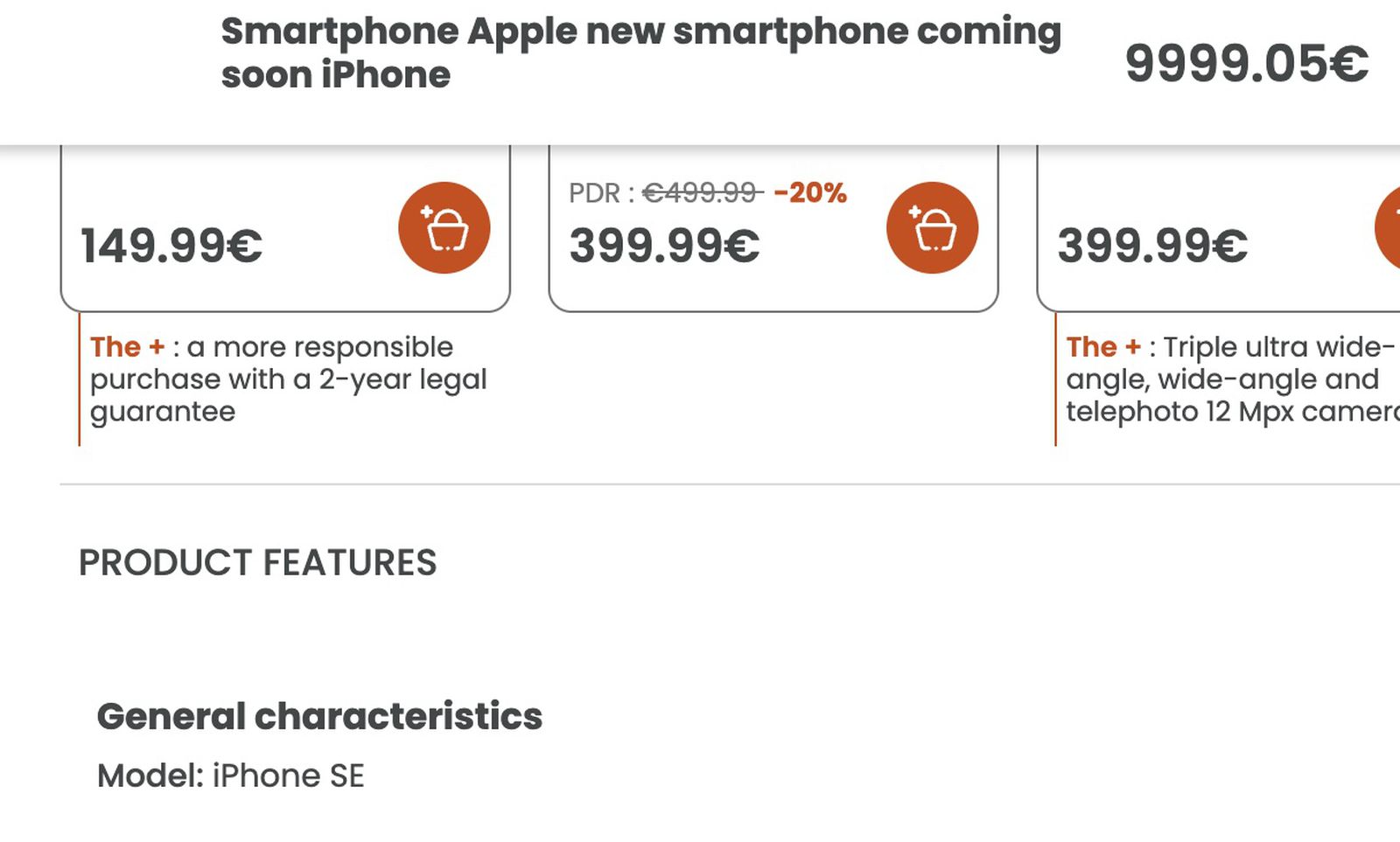 The image shows the product listing for the "new" iPhone SE on French electronics shop Boulanger's website. The likely reference is to the Apple iPhone SE 4, which was widely expected to launch this week, but did not. The iPhone SE 4 price is listed there as €9,999.05 and this clearly indicates the page is merely a placeholder.