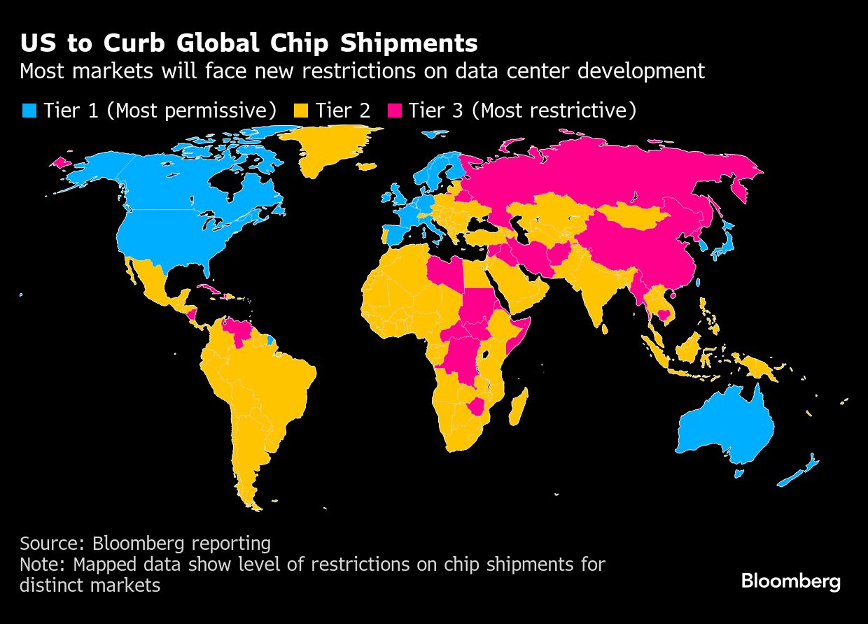 The result would be an expansion of semiconductor trade restrictions to most of the world — an attempt to control the spread of AI technology at a time of soaring demand. The regulations, which could be issued as soon as Friday, would create three tiers of chip curbs, said the people, who asked not to be identified because the discussions are private.
