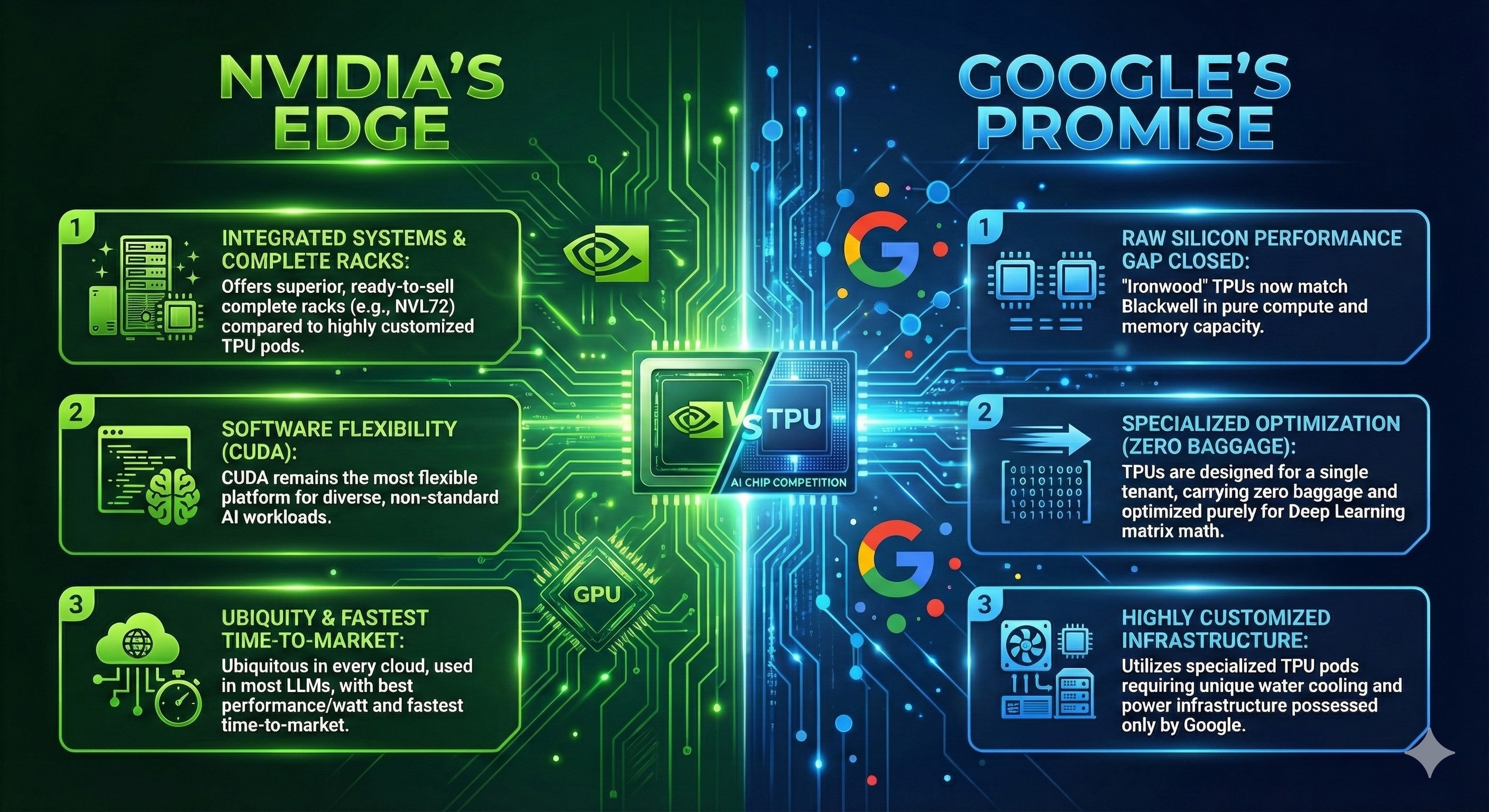 Google's TPUs, in contrast, are designed for a single tenant (Google), carry zero baggage. It is optimised purely for the matrix math of Deep Learning - making things a little bit more tricky for Nvidia as it looks to maintain its dominance in the world of AI.