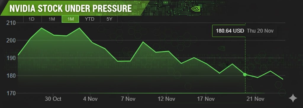Nvidia stock under pressurein the past month. (Image: Nano Banana Pro)