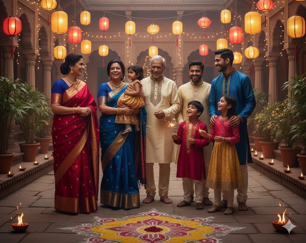 Create a realistic portrait of an Indian family celebrating Diwali in a courtyard. They are wearing traditional Indian clothing: women are wearing saris and men are wearing kurta pajamas. Keep the focus on people, with the background slightly blurred. Show beautifully lit paper lanterns all around. The scene should reflect festive joy and happiness.