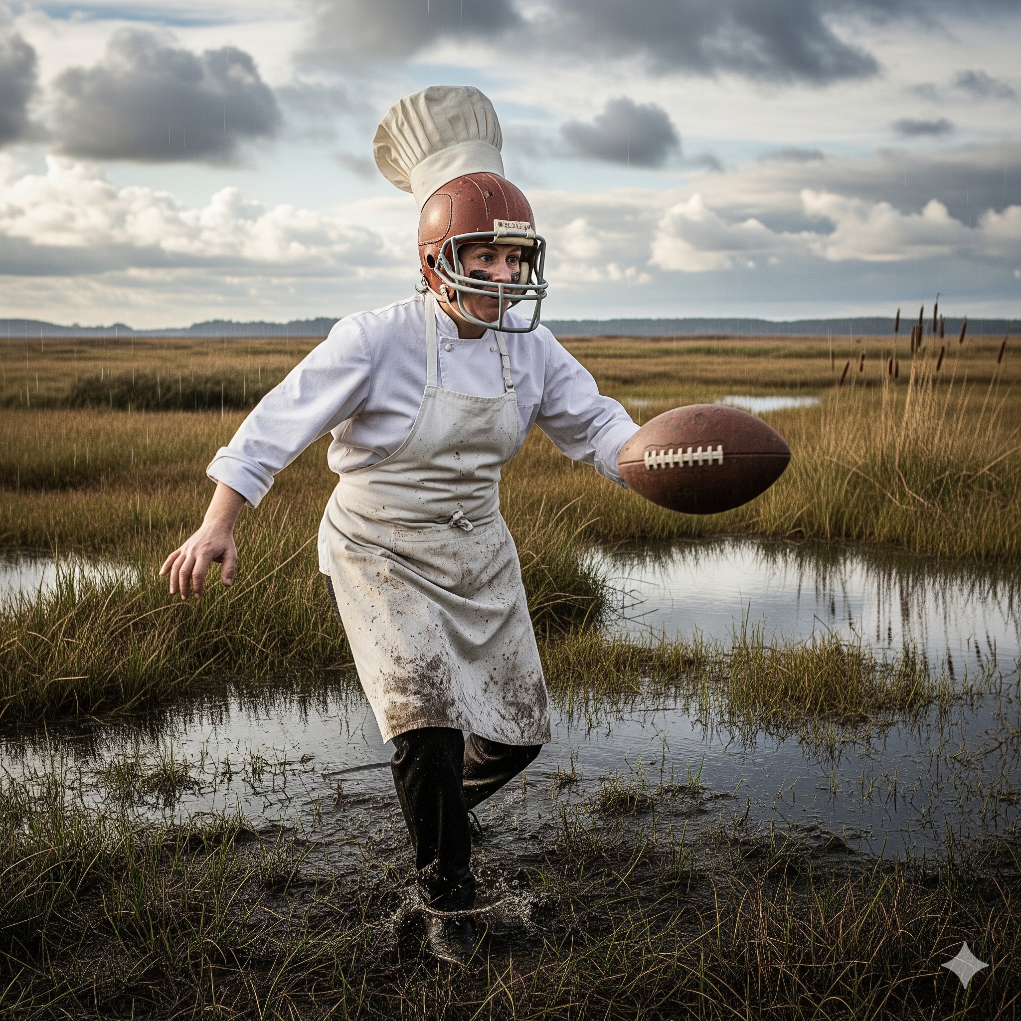 Prompt 3 (upload both and combine): Show the baker playing football in marshlands.
