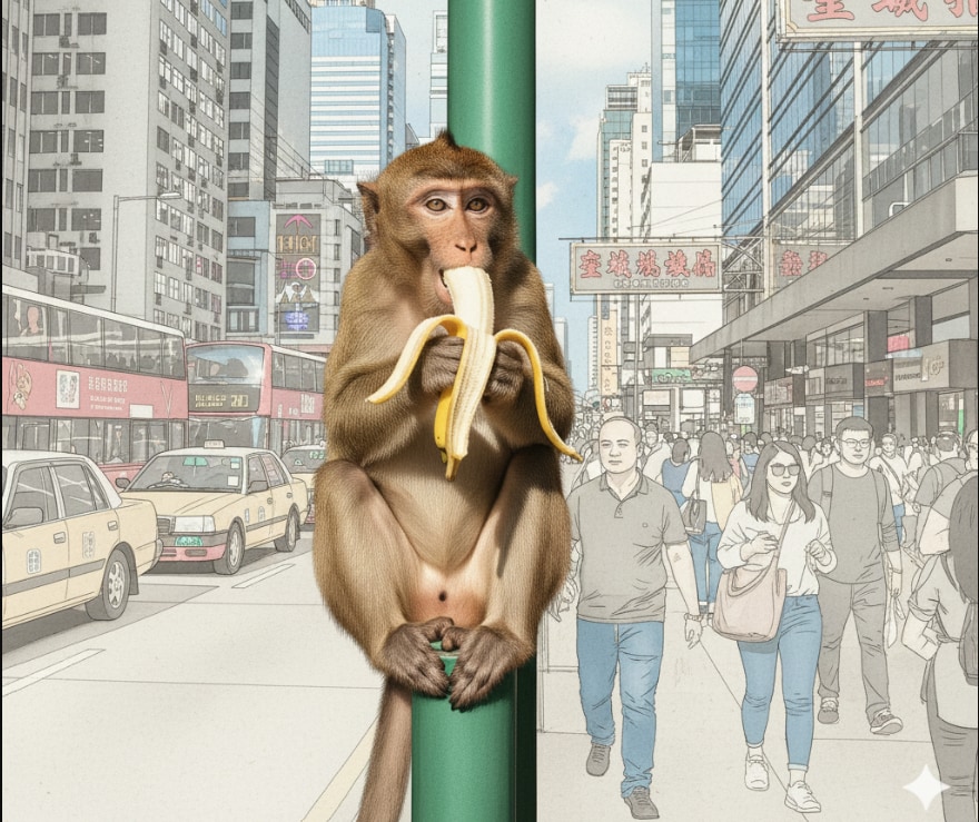 An image of a monkey eating a banana in a crowded city street. (Photo: Google Gemini AI)