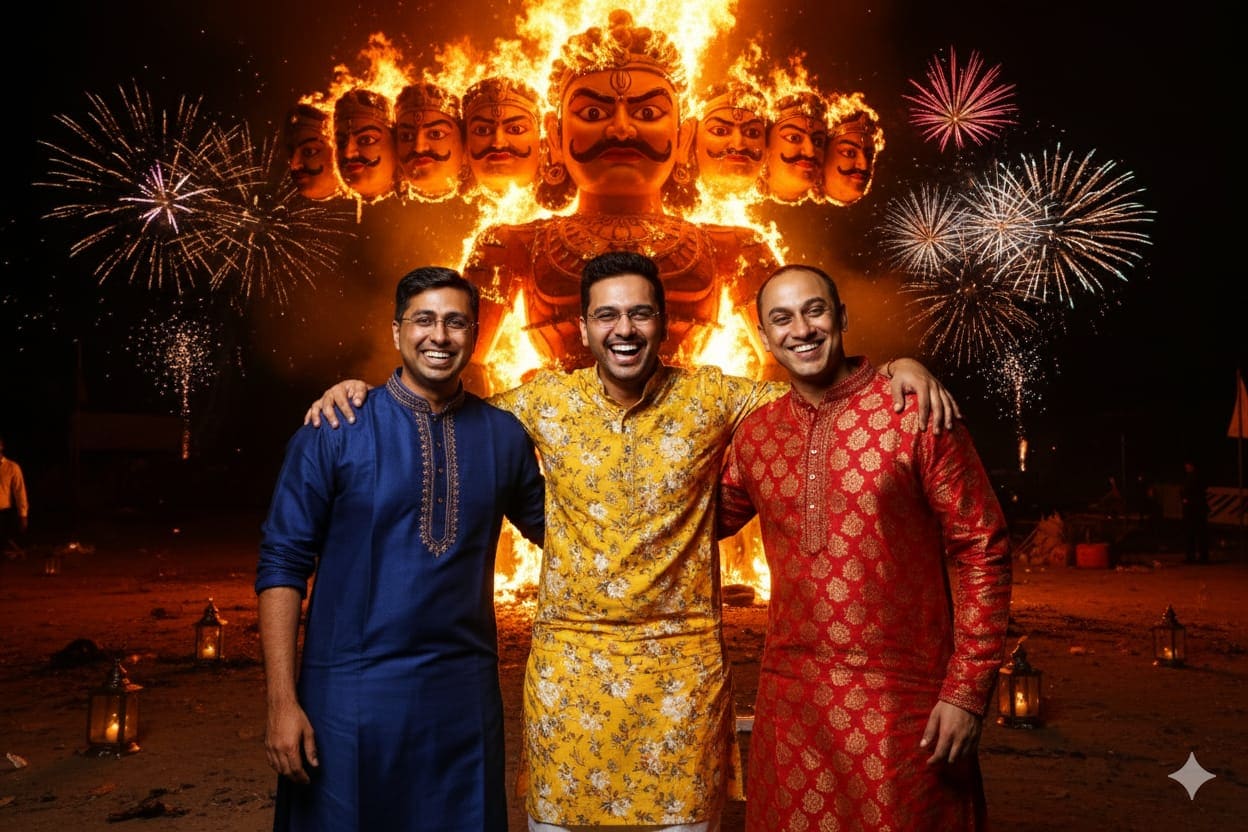 Create a dramatic Dussehra scene using this image of me and my friends. Change our attires to traditional, but keep the faces exactly the same. Behind us is a huge burning effigy of Ravana with a fierce look, big moustache, and fiery heads, plus fireworks in the sky. The overall lighting should be dramatic and intense with tones of fire all over the picture.