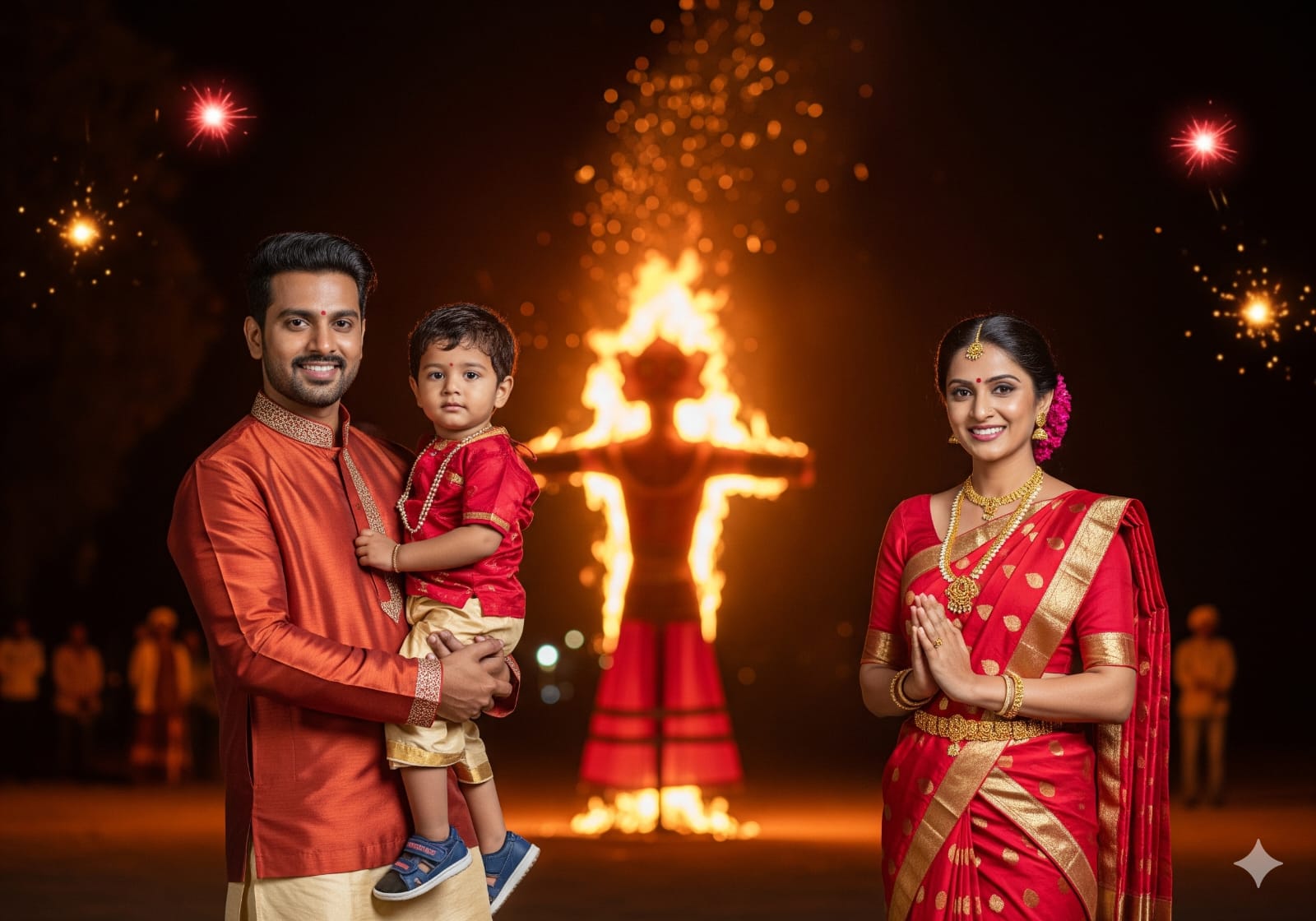 Create a Dussehra-inspired family photo with man, woman and one child, all dressed in traditional attires. Show Ravana burning in the background, all bright and lit up, along with firecrackers lighting up the night sky. Make the photo as realistic as possible.