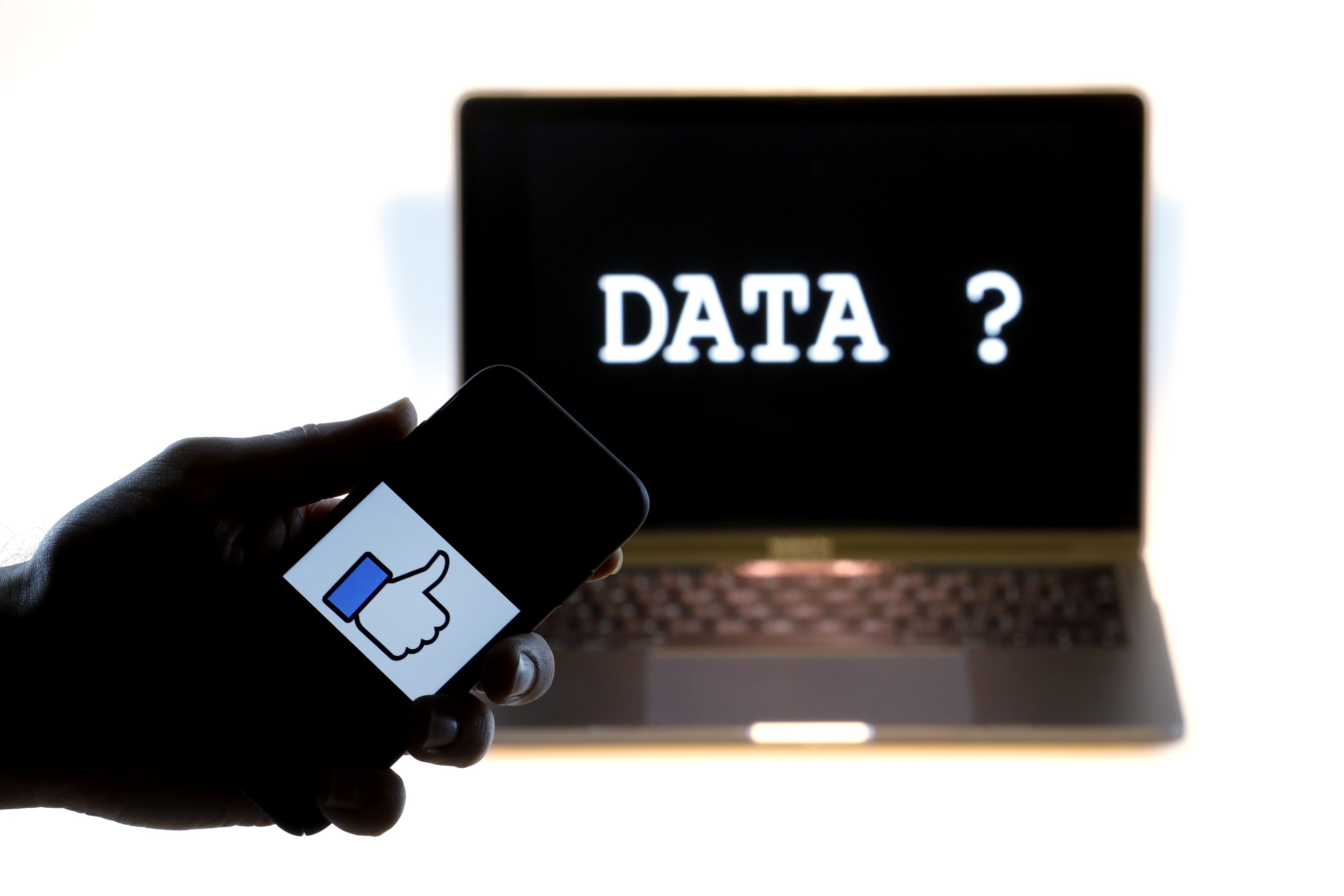 The Facebook Inc. thumbs up symbol is shown on an Apple Inc. iPhone against a computer screen displaying the word ‘Data ?’ in this arranged photograph in London, U.K. (Photographer: Luke MacGregor/Bloomberg)