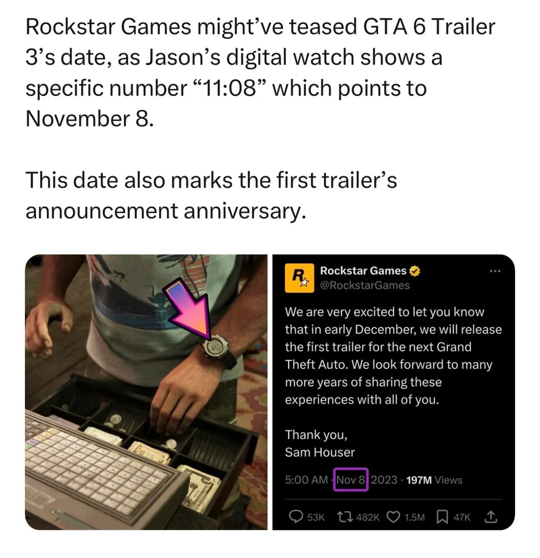 Reddit Thread: https://www.reddit.com/r/GTA6/comments/1ob6h8a/many_are_speculating_that_november_8th_is_the/