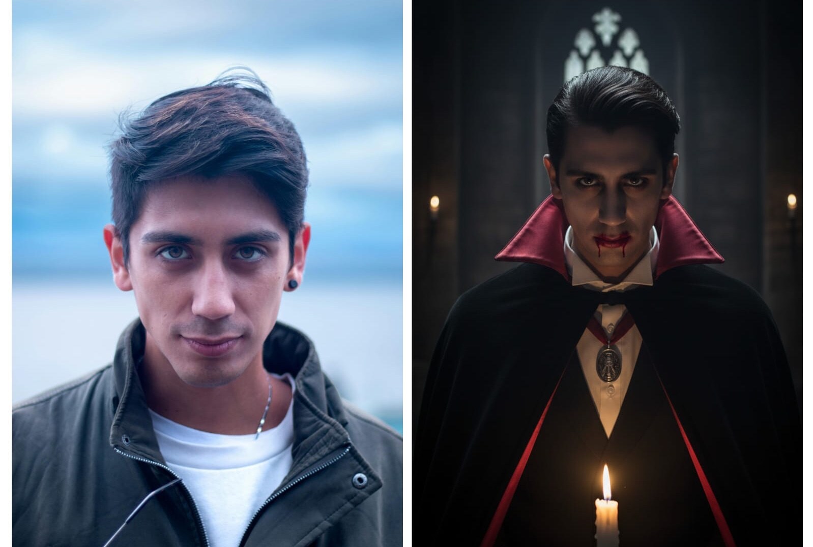 Make me Dracula! Give me a very realistic Dracula look, with a piercing, intense gaze and a little blood staining my lips. Add only a bit of makeup on my face, keeping the overall facial features as they are. I am wearing the iconic Dracula attire: a flowing black cape lined in vivid red with a tall, upright collar, a white shirt, and a medallion suspended from a ribbon at my neck. Create an overall gothic atmosphere, illuminated by a single flickering candlelight.