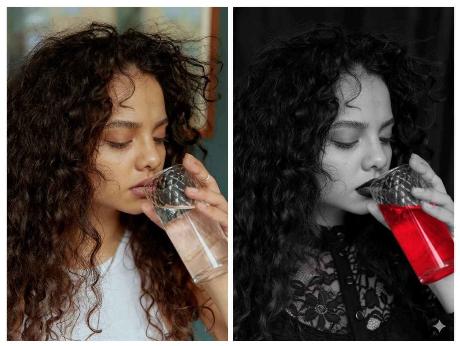 Create a gothic portrait using the woman in this image. Change her clothing's colour to black with her face turned more white. The background should be dark as well. The overall picture should be monochrome, and the only colour should be the very bright red drink that the woman is having from the glass.