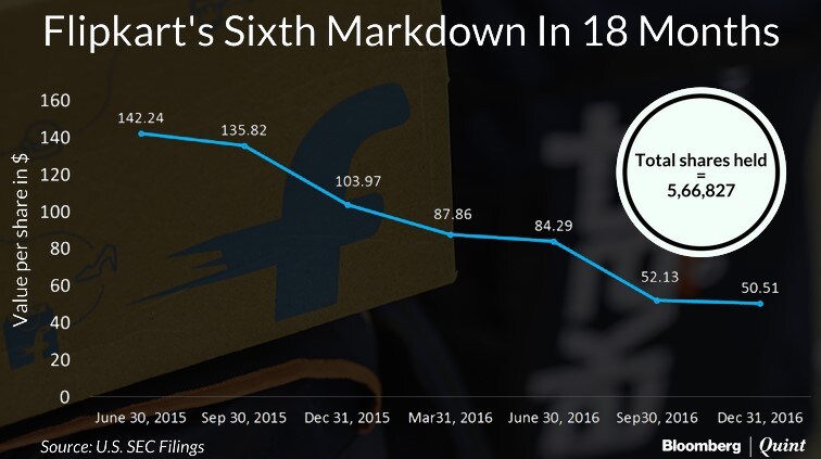 India's first unicorn, Flipkart saw its sixth consecutive markdown by a mutual fund managed by Morgan Stanley. The fund which currently holds 5,66,827 shares in the e-commerce company, has reduced the value of its stake by as much as 67 percent, from its highest point of $142.24 per share in the quarter-ended June 2015.