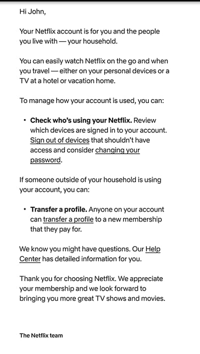 "A Netflix account is for use by one household. Everyone living in that household can use Netflix wherever they are — at home, on the go, on holiday — and take advantage of new features like Transfer Profile and Manage Access and Devices," the company said.