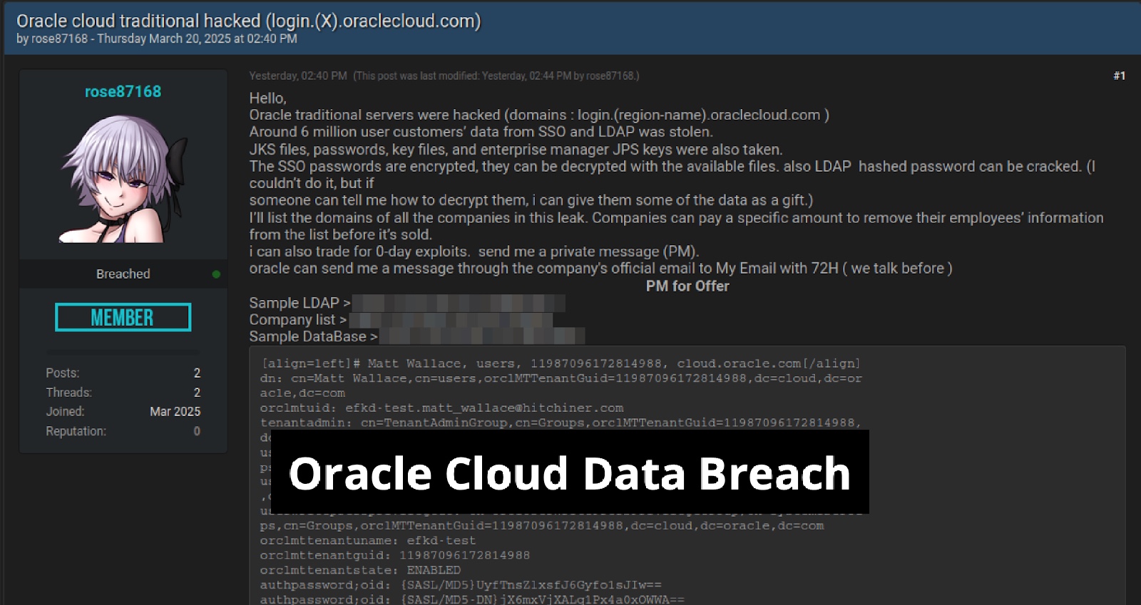 CloudSEK's investigation was launched on March 21, after its threat intelligence platform detected a threat actor, identified as “rose87168,” offering 6 million records for sale—data allegedly exfiltrated from Oracle Cloud's Single Sign-On (SSO) and Lightweight Directory Access Protocol (LDAP) systems.