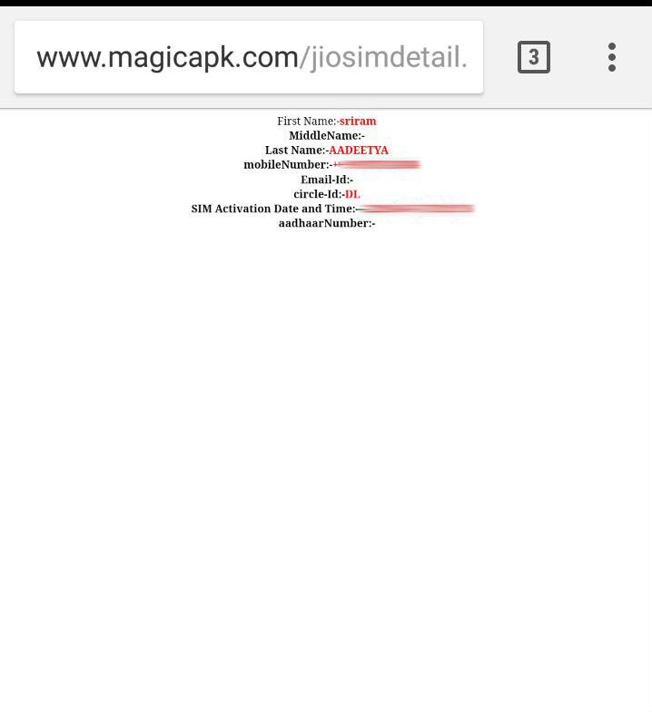 July 9, 2017Jio was one of the first telecom operators in India to use Aadhaar ID for SIM activation. Users were signed up in a matter of minutes just by verifying their biometric data and their Aadhaar number.As you can see below, even though the Aadhaar number isn't revealed here, one cannot be sure that whoever has registered the website doesn't already have the details with them.