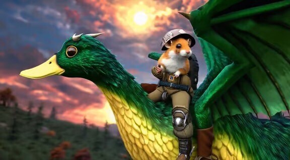 February 15, 2024Another user requested: "A half duck half dragon flies through a beautiful sunset with a hamster dressed in adventure gear on its back."