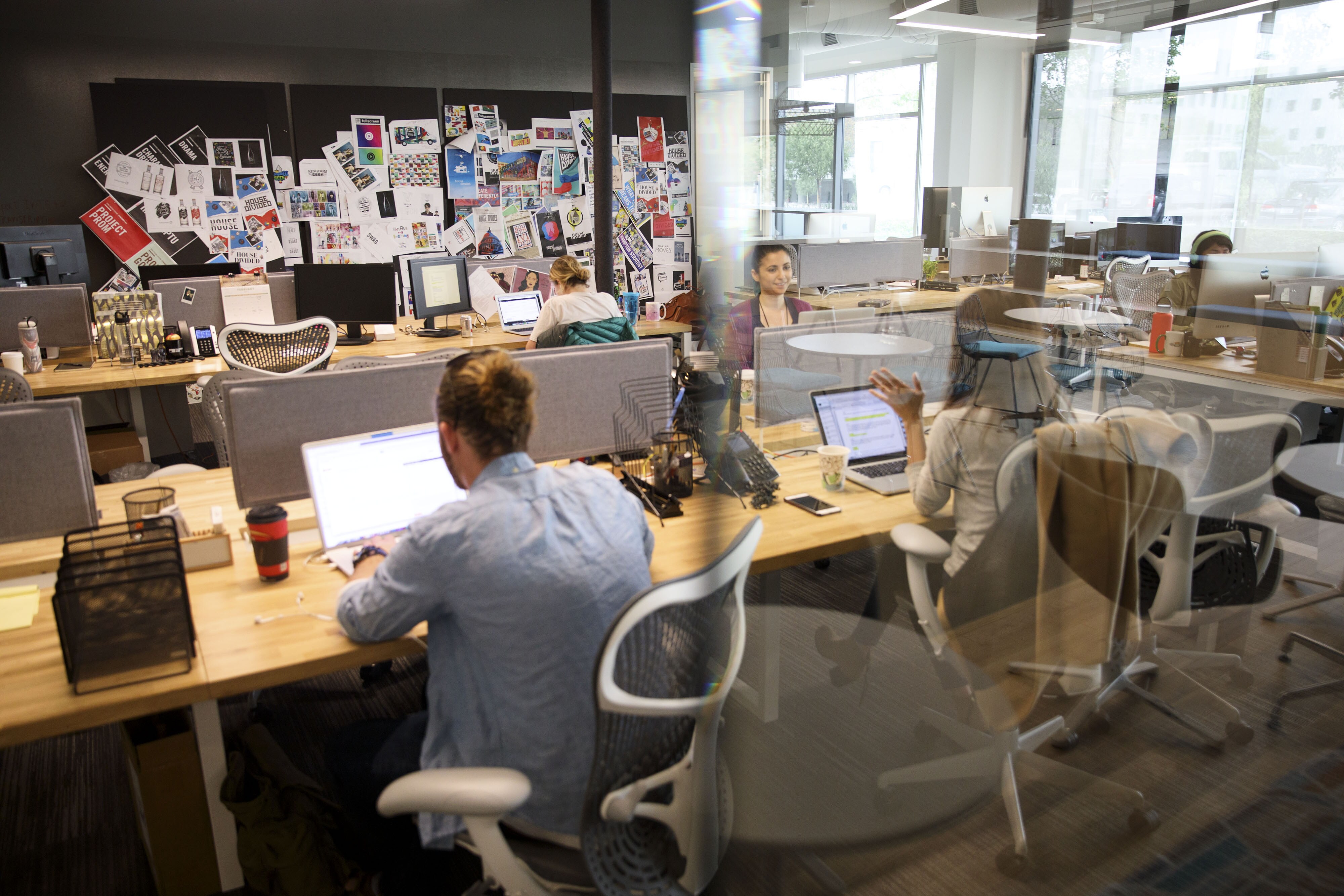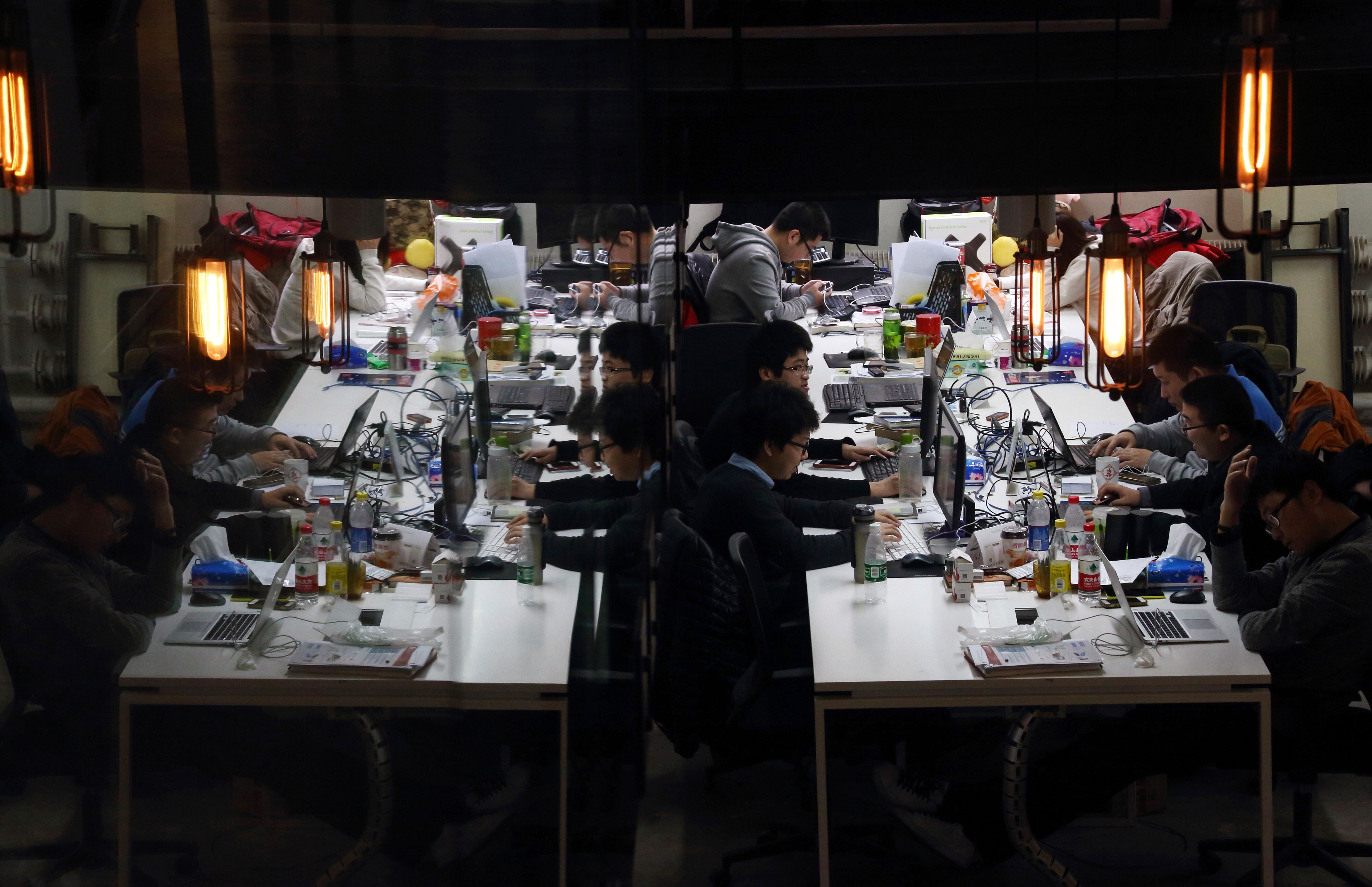 Workers using computers at their desks are reflected in a glass door inside Tech Temple, a co-working space for start-up companies sponsored by Infinity Ventures Partners, in Beijing, China (Photographer: Tomohiro Ohsumi/Bloomberg)